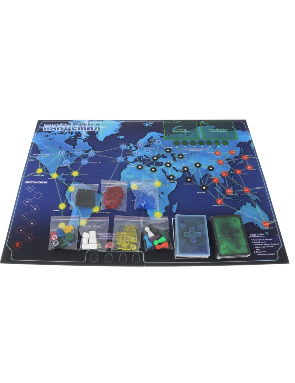 Пандемия - кооперативная игра. Все игроки или выигрывают, или проигрывают одновременно. Цель игры: изобрести лекарства от всех четырех болезней. У каждого игрока есть своя роль с особыми способностями, помогающими команде победить. Ход каждого игрока состоит из трех шагов. Совершить четыре действия, взять две карты игроков, обнаружить болезни в городах.