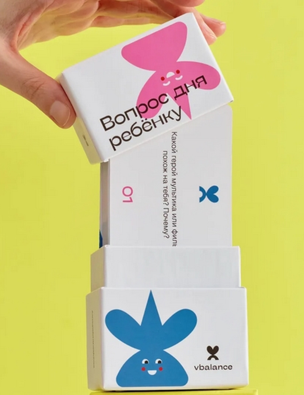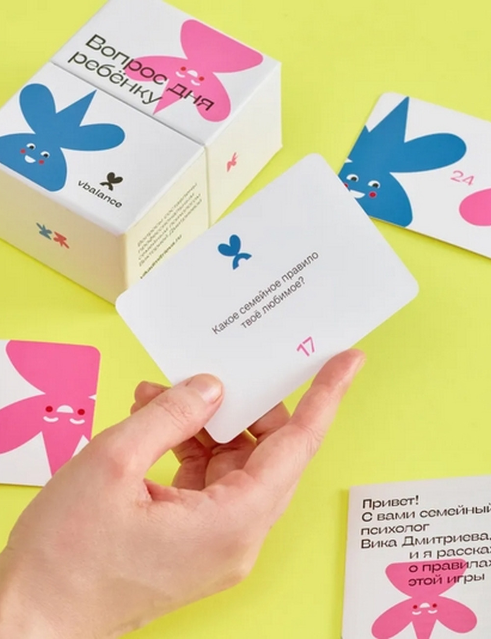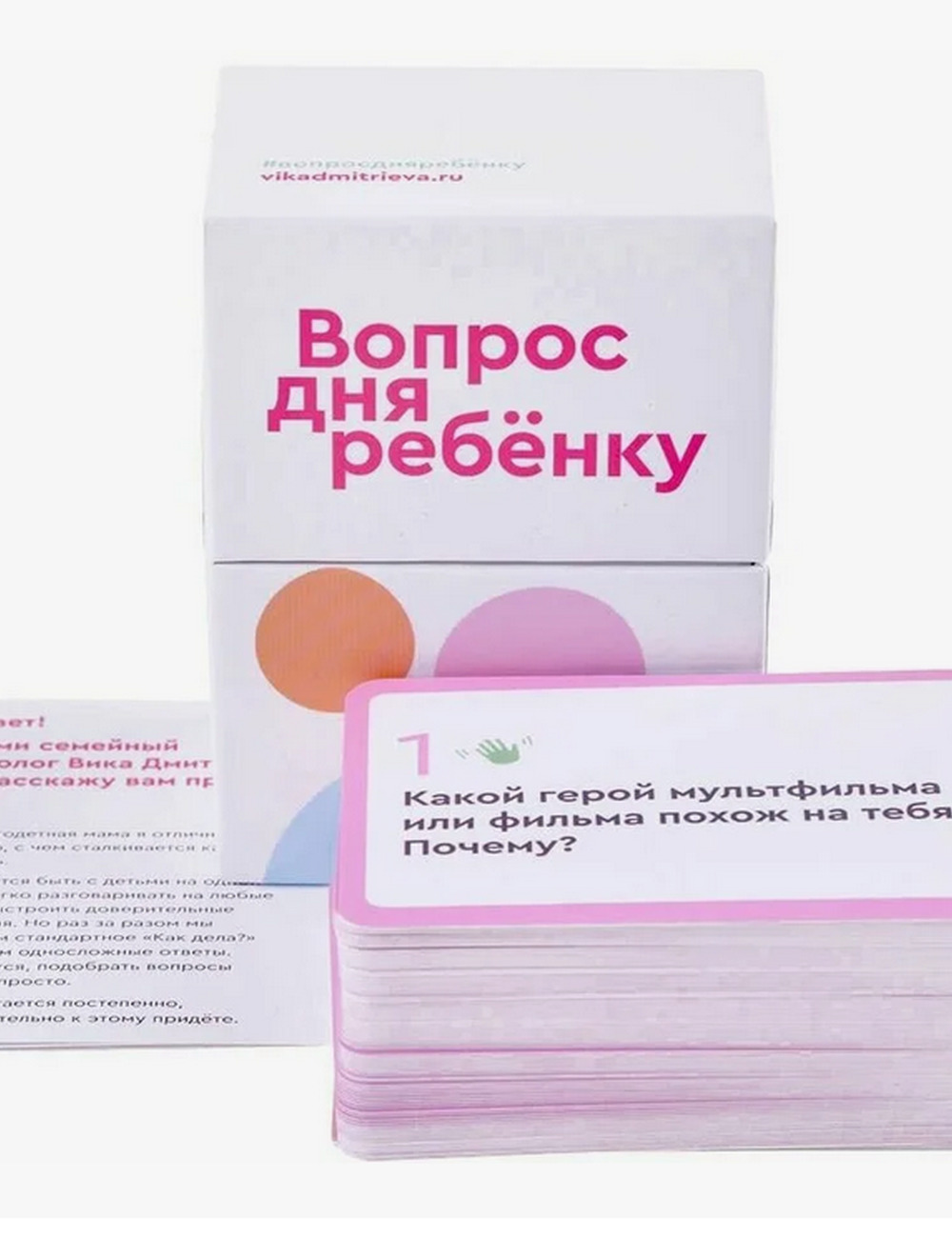 Настольная карточная игра для всей семьи "Вопрос дня ребёнку" от семейного психолога и автора популярного блога Вики Дмитриевой. Игральные карточки в коробке выполнены в удобном, компактном формате. Оригинальный сюрприз и интересный подарок на день рождения, 1 сентября, новый год или любой другой праздник, который не оставит равнодушным ни девочку, ни мальчика. Нам хочется быть с детьми на одной волне и легко разговаривать на любые темы, но раз за разом мы повторяем стандартное «как дела?» и получаем односложные ответы. Оказывается, подобрать вопросы бывает непросто. В этой настолке я подготовила для вас такие вопросы, которые в игровой форме позволят максимально раскрыть новые грани отношений и укрепить связи. Именно живое общение с любящим взрослым может подарить всё самое необходимое не только для эмоционального благополучия ребёнка и его психологического комфорта. Интересные задания, развивающие мышление способствуют построению искренних и доверительных отношений мамы и папы как с малышами, так и с подростками. Играйте в детские развивашки, где угодно: дома, в путешествии, на прогулке, в компании, в дороге или дома. Главное: внимательно выслушивайте ответы и будьте собой — так вы не только лучше поймёте своего ребёнка, но и самого себя. И пожалуйста, не ждите, что ваши дети будут такими, как вы или такими, как вы хотите. Просто помогите им стать собой. С любовью, ваша Вика Дмитриева.