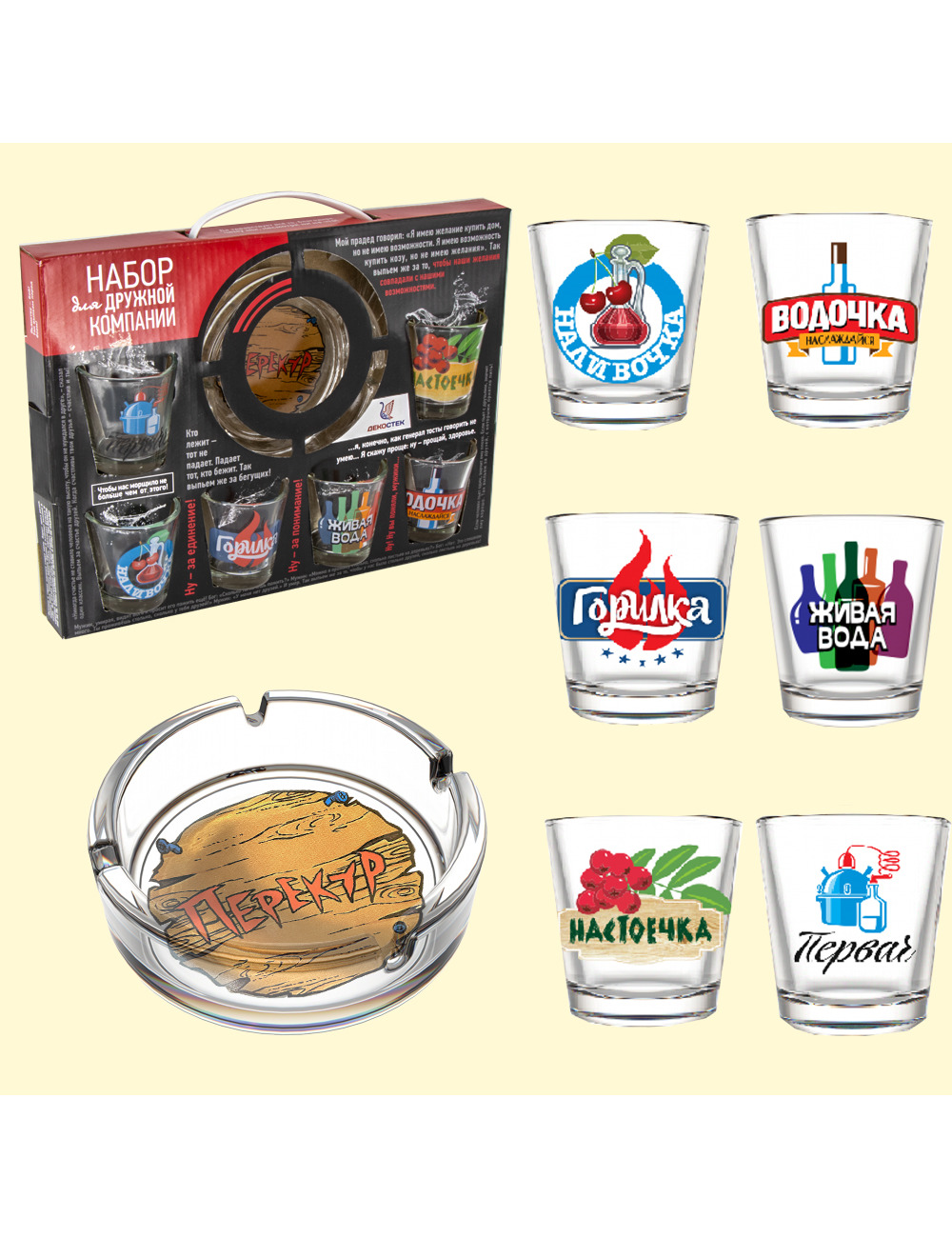 Набор декорирован названиями самых популярных народных крепких напитков, сделанных в стиле логотипа.