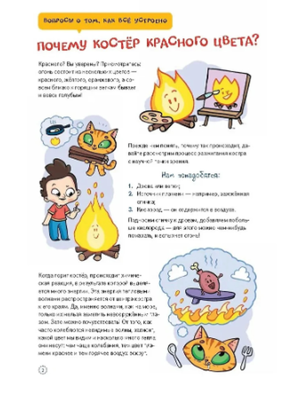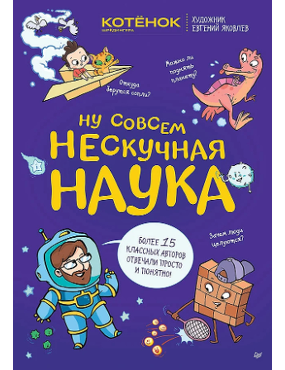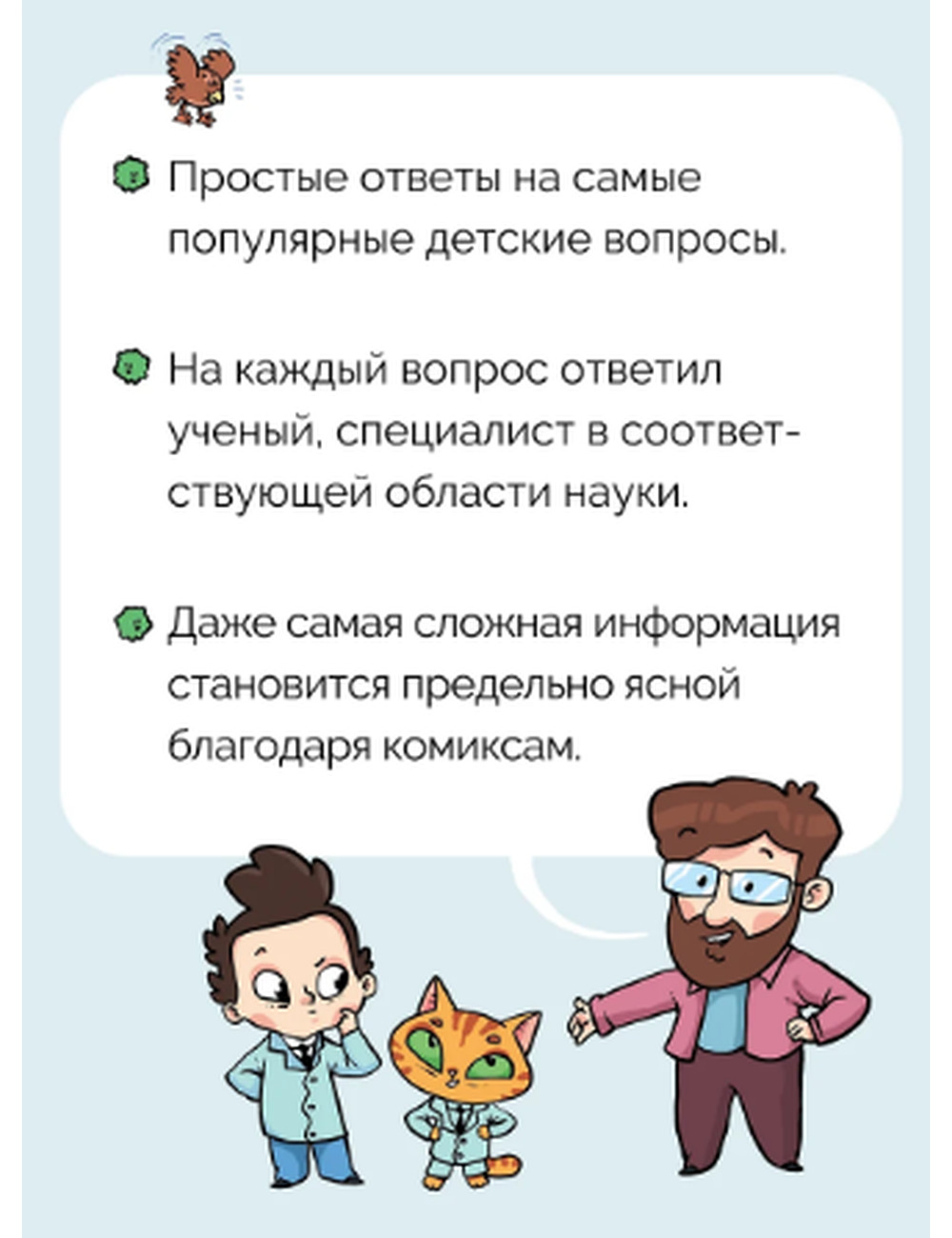 Почему костёр красного цвета? Можно ли поднять планету? Почему самолёты не падают? Существует ли таблетка от глупости? Зачем папа бреет голову, а мама ноги? Об этом и многом другом дети постоянно спрашивают взрослых. Мы собрали самые неожиданные вопросы о нас самих и об окружающем мире, а потом попросили умных старшеклассников, студентов и учёных из самых передовых российских университетов ответить на них. Они рассказали о сложных вещах на понятном детям языке. Благодаря весёлым картинкам художника-комиксиста Евгения Яковлева книга получилась не только познавательной, но и забавной.