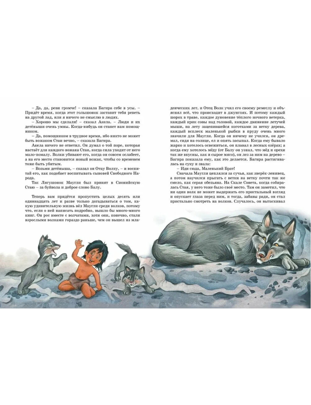 «Мы с вами одной крови, я и вы!» Английский писатель Редьярд Киплинг подарил детям историю о храбром герое, воспитанном волчьей стаей. Вместе с друзьями — добрым медведем Балу, изящной пантерой Багирой и умным питоном Каа — Маугли, имя которого означает «лягушонок», противостоит суровому миру джунглей. Сможет ли мальчик победить подлого тигра Шер-Хана, рыжих диких псов, коварных обезьян Бандар-логов? И найдёт ли своих настоящих родителей? Обо всём этом — в книге.