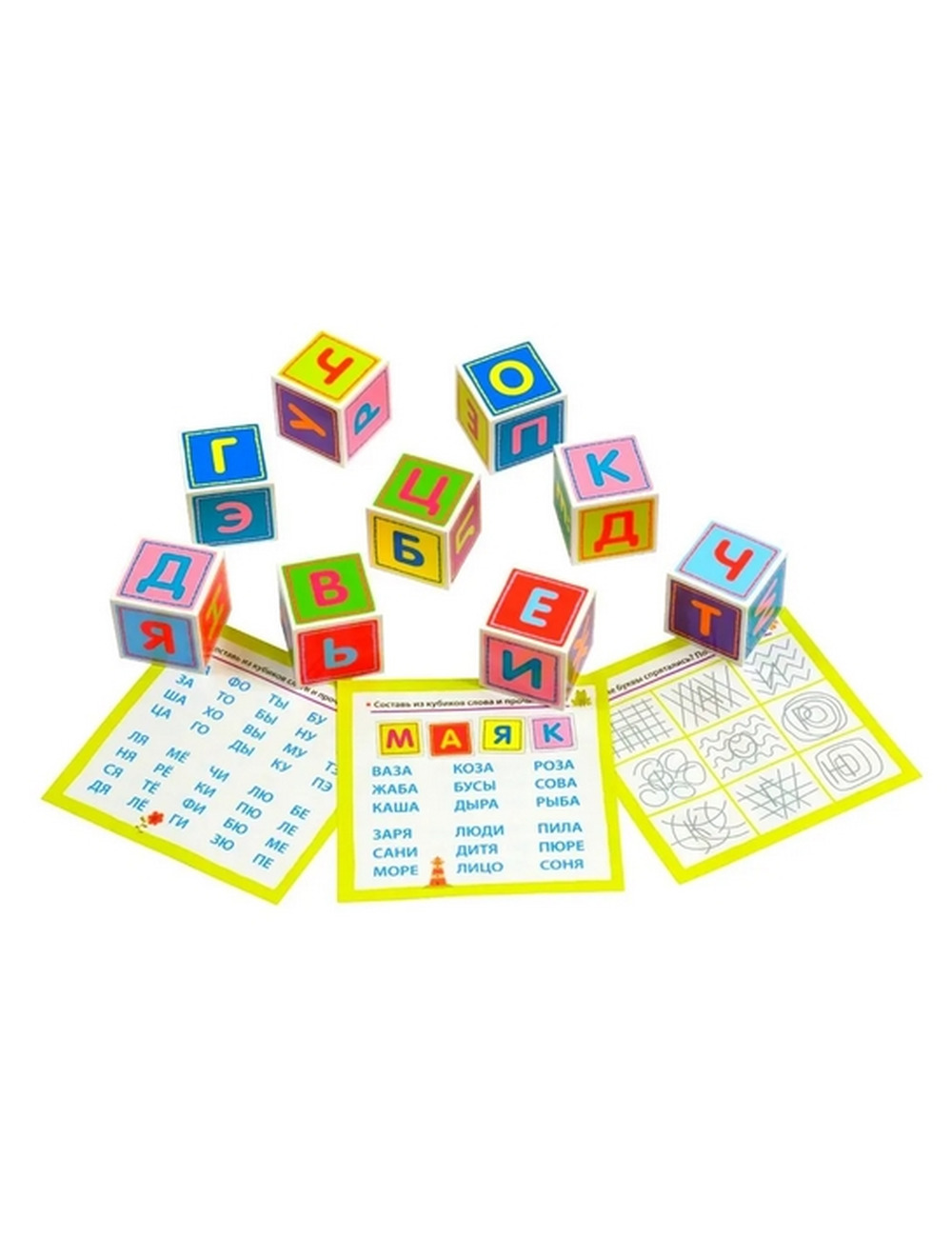 Набор состоит из 9 кубиков с буквами. На листовках даны различные задания на знание букв и чтение, которые нужно выполнить с помощью кубиков. Ребенок будет учить буквы, составлять из них слова, читать. Во время игры происходит изучение алфавита, развитие навыка чтения, тренировка мелкой моторики. Наклейки на кубики сделаны из качественной гладкой бумаги, которая не портится от игры. Набор предназначен для детей от 4 лет.