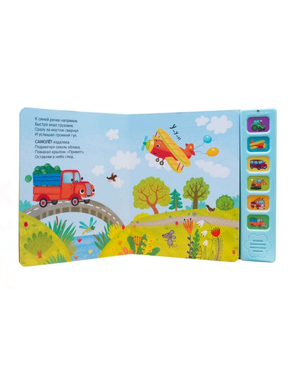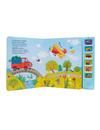 В книге 6 звуковых кнопок, нажимая на которые, ребенок услышит гул самолета, сирену пожарной машины и другие звуки транспорта. Звук можно выключить повторным нажатием на кнопку.