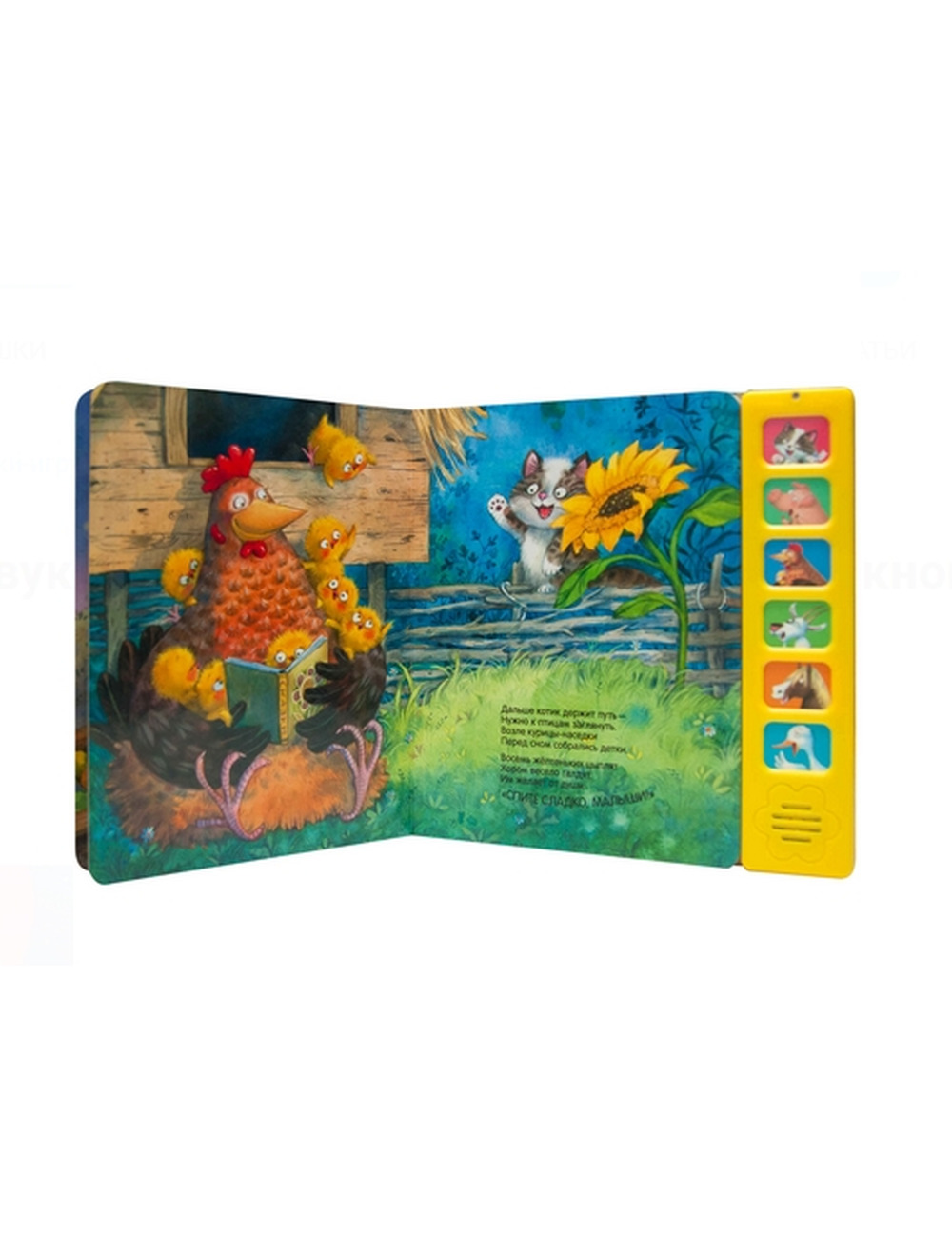 Эта замечательная звуковая книга с волшебными иллюстрациями Л. Ереминой и добрыми стихами обязательно понравится малышу. Вместе с забавным котенком он пожелает: «Спокойной ночи!» - лошадке, утятам, свинке, курице и другим домашним животным. Нажимая на кнопки, ребенок сможет послушать 6 разных звуков: кряканье утят, ржание лошадки и другие.