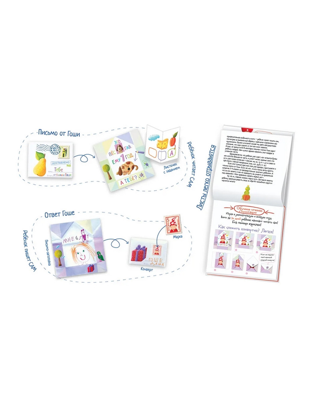 В блокноте представлен уникальный метод обучения чтению. Это 30 волшебных писем от гномика Гоши, адрессованных ребёнку. Ребёнок читатет их сам, без помощи взрослых. Родителям нужно просто каждый вечер незаметно класть готовое письмо под подушку спящего ребёнка. Уровень сложности рассчитан на детей, которые знают буквы и умеют читать простые слоги. При желании гномику можно написать ответ. Для этого в блокноте есть готовые письма-конверты и марки-наклейки. Также в письмо можно дополнительно вложить листочек с интересным заданием.