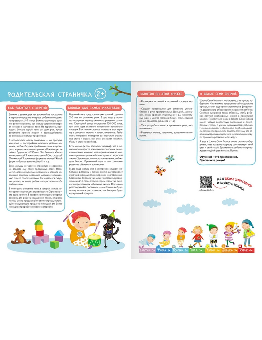 Система выстроена таким образом, чтобы ребёнок получил необходимые знания в правильный момент. Поэтому все книги в Школе Семи Гномов имеют четкую возрастную адресацию и разработаны строго с учетом возрастных возможностей ребенка. Но самое важное, чтобы занятия с ребенком давали результат и приносили радость. Поэтому все задания выстроены от простого к сложному и следуют принципу «развитие через игру». Заниматься с ребенком может любой взрослый, специальных знаний и опыта не требуется. Родительская страничка в каждой книге подскажет, что, как и почему нужно развивать в данном возрасте.