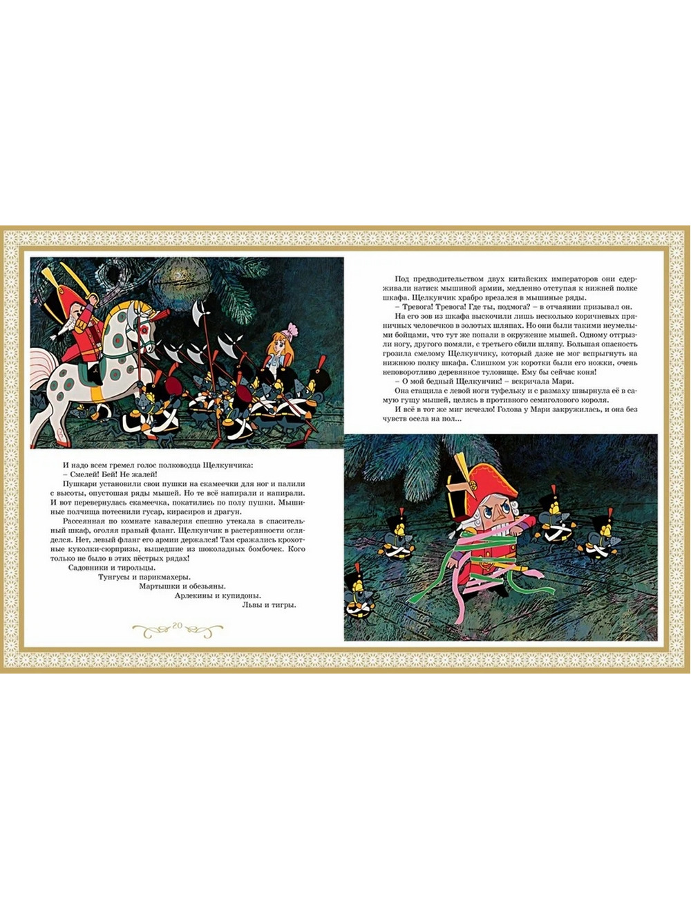 В чудесный миг волшебства персонажи замирают на книжных страницах. Сказка и анимация переплетаются причудливым узором. приглашая читателя в красочный мир любимых мультфильмов. Уникальное издание «Щелкунчик и Мышиный король» Э. Т. А. Гофмана в пересказе Л. Яхнина станет идеальным подарком для каждого. кто хотел бы сохранить тёплое воспоминание из детства на своей книжной полке! Мари не подозревала. сколько волшебных приключений ждет её после встречи с таинственным Щелкунчиком. В канун Рождества. когда игрушки оживают. и всюду звучит чудесная музыка. зло не дремлет. Страшный Мышиный король собирается на бой с Щелкунчиком. Удастся ли героям победить его и снять древнее проклятье? Или развеять чары невозможно? И при чем здесь Кракатук?