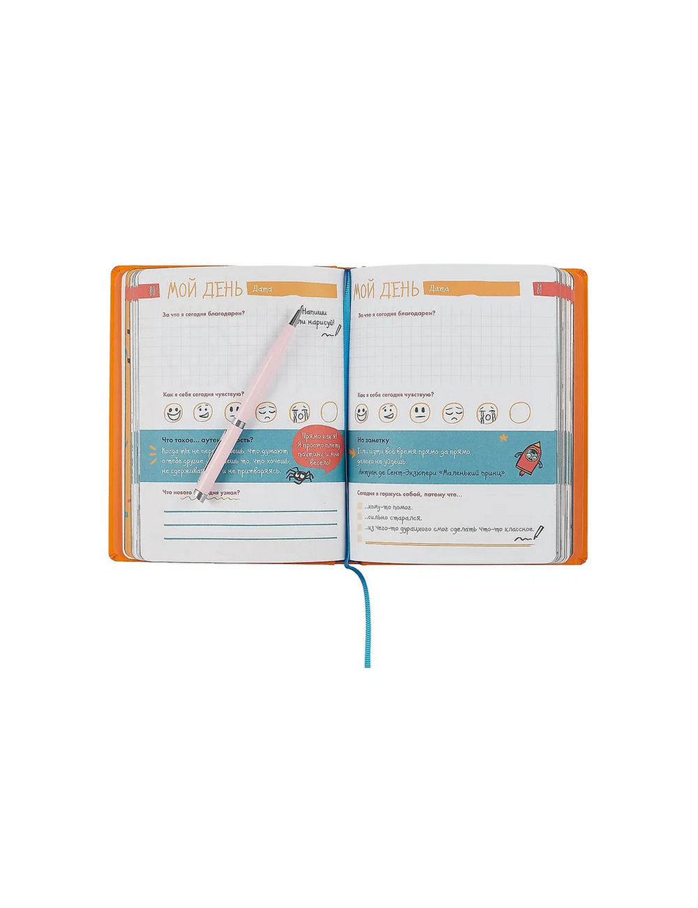 Ежедневник учитывает особенности возрастной психологии детей, поэтому информация подается в игровом формате: заполнение дневниковых записей чередуется с рисованием, ответами на вопросы, интересными фактами и полезной информацией из области психологии. Чтобы ребенку было легче воспринимать материал, на протяжении всего ежедневника его будут сопровождать два героя: мальчик Паоло и его воображаемый друг, проказник Минути.