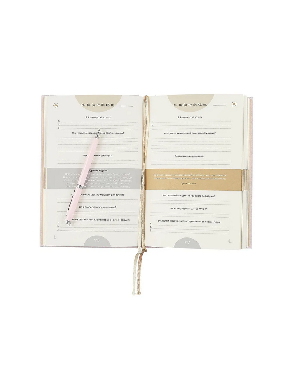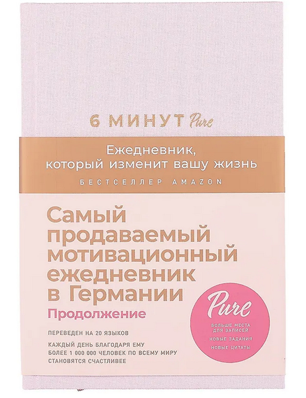 «6 минут PURE» — это продолжение бестселлера Amazon, самого продаваемого в Германии мотивационного ежедневника «6 минут. Ежедневник, который изменит вашу жизнь». Доминик Спенст создал новое издание по многочисленным просьбам и пожеланиям читателей. В ежедневнике теперь меньше теории и больше страниц для самостоятельного заполнения, а еще — новые еженедельные ритуалы, цитаты, задания и вопросы. • Продолжение бестселлера Amazon, самого продаваемого в Германии мотивационного ежедневника «6 минут. Ежедневник, который изменит вашу жизнь». • Авторский метод, основанный на научных данных. Каждый день ежедневником пользуются более 1 000 000 человек, делая свою жизнь более осознанной и позитивной. • Меньше теории — больше места для записей. • Новые еженедельные ритуалы, новые вопросы, задания и цитаты. Подойдет тем, кто уже знаком с первым изданием и хочет продолжить заполнять ежедневник в новом формате, а также тем, кто только начинает знакомиться с Принципом 6 минут®. • Больше места для записей. • Новые задания. • Новые еженедельные ритуалы. • Новые цитаты. Тканевый переплет, 2 закладки-ляссе, шелковистые тонированные страницы, недатированный. Рассчитан на заполнение в течение 6 месяцев.