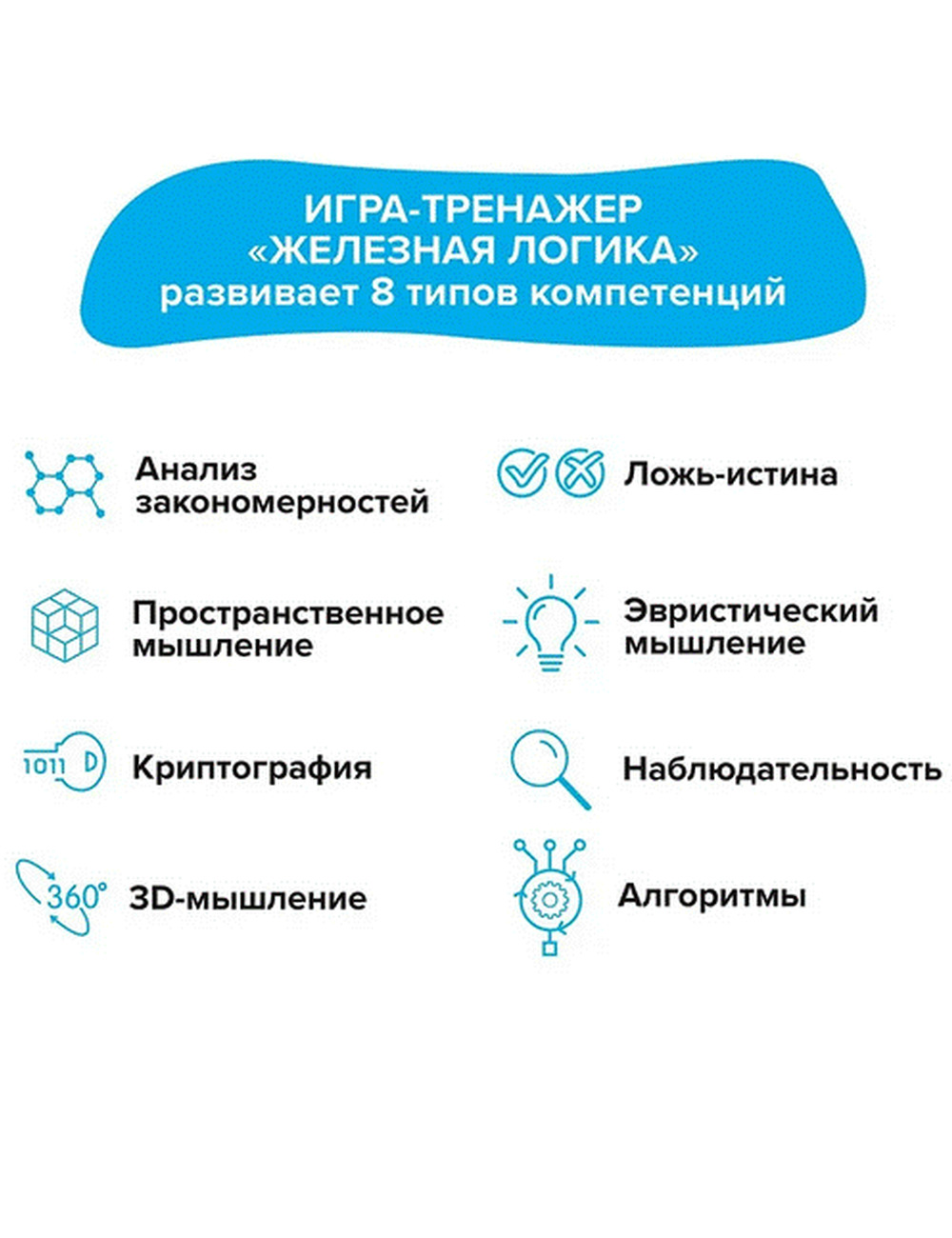 Brainy Trainy «Железная логика» не просто учит решать задачи определённого типа. Уникальная методика позволяет развить широкий репертуар компетенций, необходимых для полноценного логического мышления. В результате у ребёнка формируется целостный подход к решению любых задач: в том числе тех, с которыми он не сталкивался ранее.