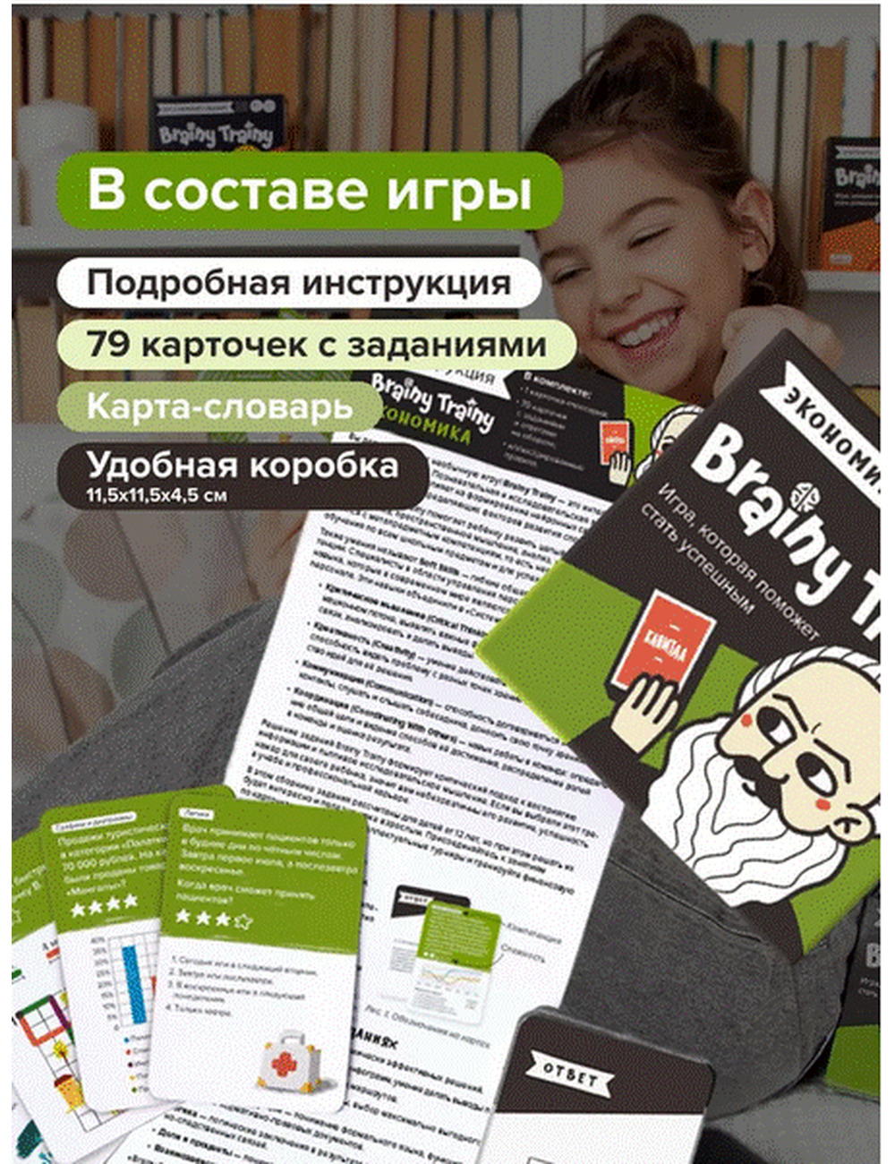Игра Brainy Trainy «Финансовая грамотность» учит ребёнка видеть выгодные решения, рыночные закономерности, а также критически оценивать акционные предложения и мыслить как предприниматель. В этом сборнике задания рассчитаны для детей от 12 лет, но при этом решать их будет интересно даже взрослым.