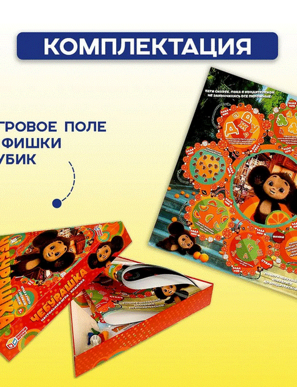 Маленький ушастый зверёк по имени Чебурашка очень любит сладости! Помогите любимому герою добраться до кондитерской и как следует подкрепиться! Скорее бросайте кубик, выполняйте увлекательные задания и бегите к финишу.