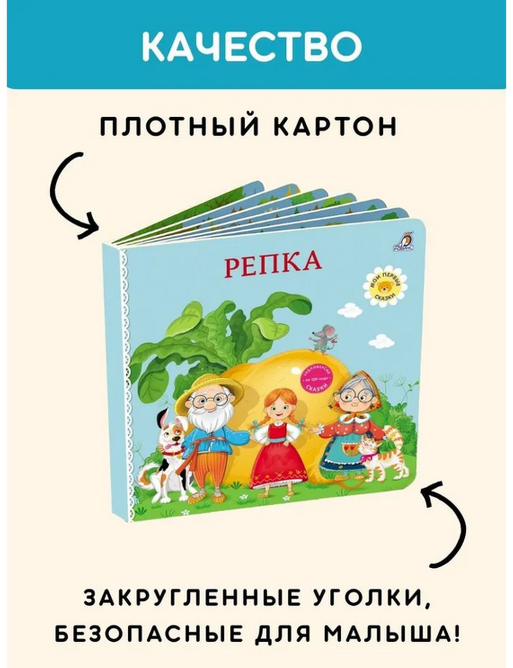 Книжка-картонка «РЕПКА» – пересказ популярной русской народной сказки. Эта добрая и поучительная сказка поможет ребёнку лучше понять мир. Её народная мудрость даст малышу первое представление о добре, зле и справедливости.