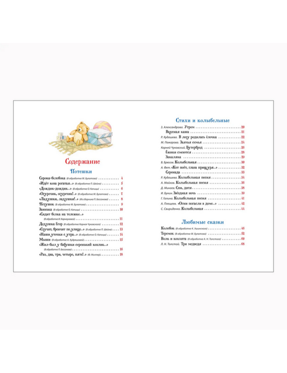 В сборник вошли русские народные сказки, веселые потешки, трогательные колыбельные-засыпайки и стихи-болтушки для самых маленьких. Яркие страницы с большими иллюстрациями, крупный шрифт для удобства чтения с ребенком, тексты в обработке профессиональных литераторов.