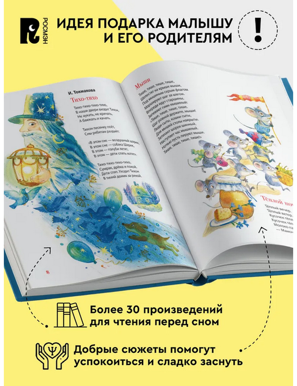 В этой красочно иллюстрированной детской книге собраны веселые стихи, убаюкивающие колыбельные, русские народные сказки и волшебные истории со всего света. Более 30 произведений для совместного чтения с малышом и в качестве короткой сказки на ночь.