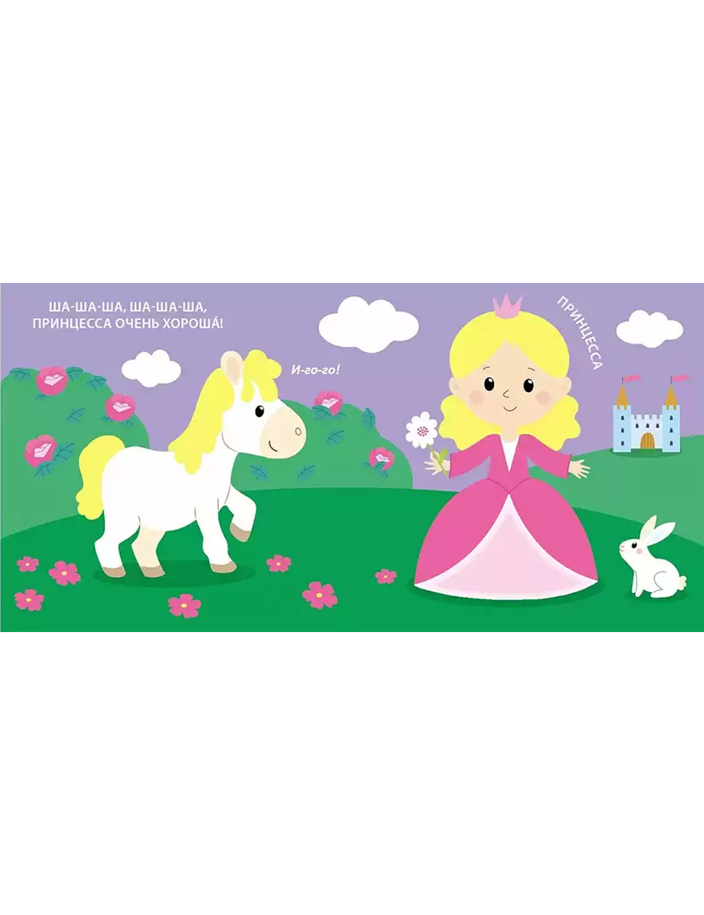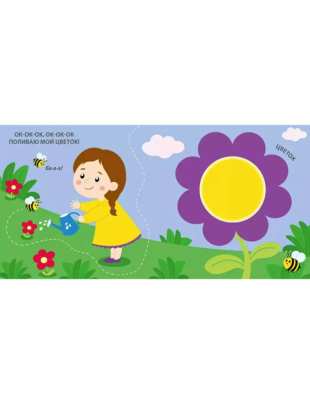 На каждом развороте книги есть тактильная вставка и чистоговорка для запуска и развития речи.