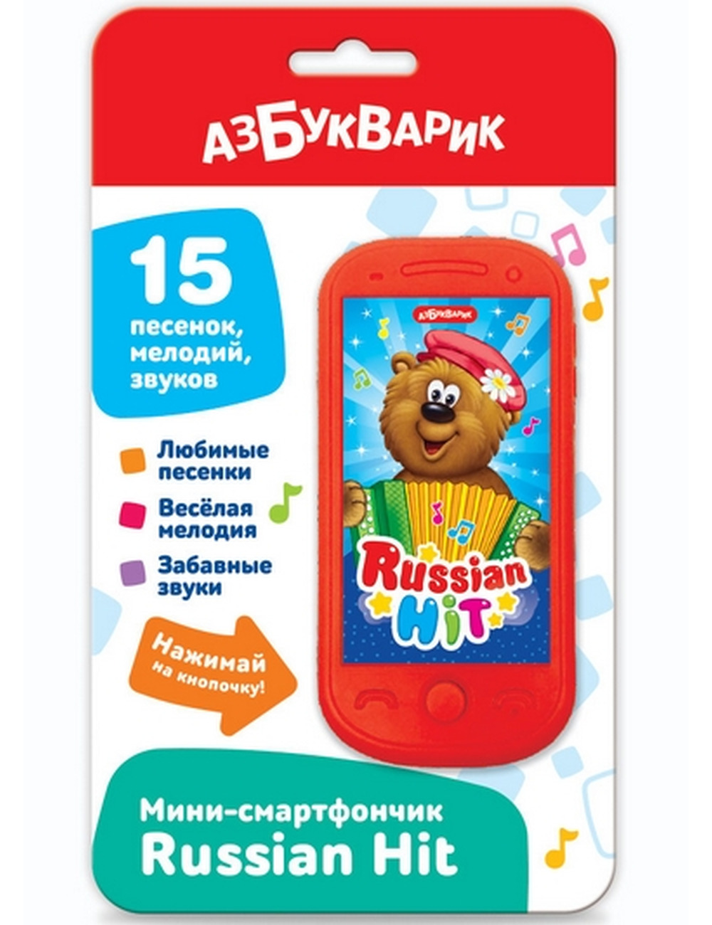 На дисплее — медведь с гармошкой, с ним малыш сможет подружиться и послушать детские хиты в русском народном стиле: «Медвежонок – лучший друг», «Топ-топ-топ», «Калинка», «Два весёлых гуся», «Антошка» и другие. Всего 15 песенок и мелодий. Он снова и снова будет нажимать на яркую кнопочку мини-смартфона.