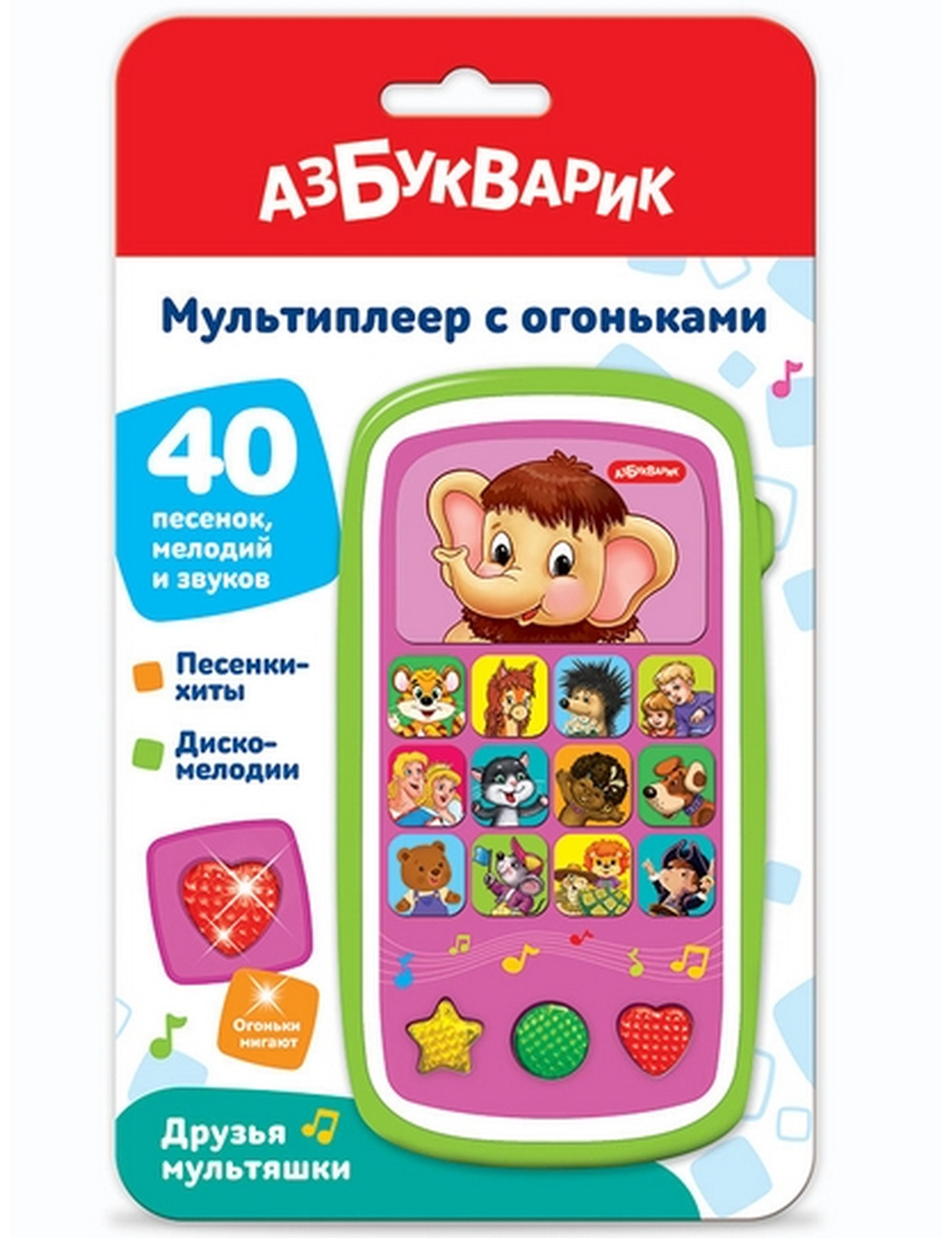 Мультиплеер с огоньками «Друзья мультяшки» порадует своим ярким дизайном: он похож на настоящий «взрослый» смартфон. С такой игрушкой малыш будет занят надолго! Игра с таким мультиплеером не только развлекает малыша, но и развивает у него музыкальные способности, память, воображение.
