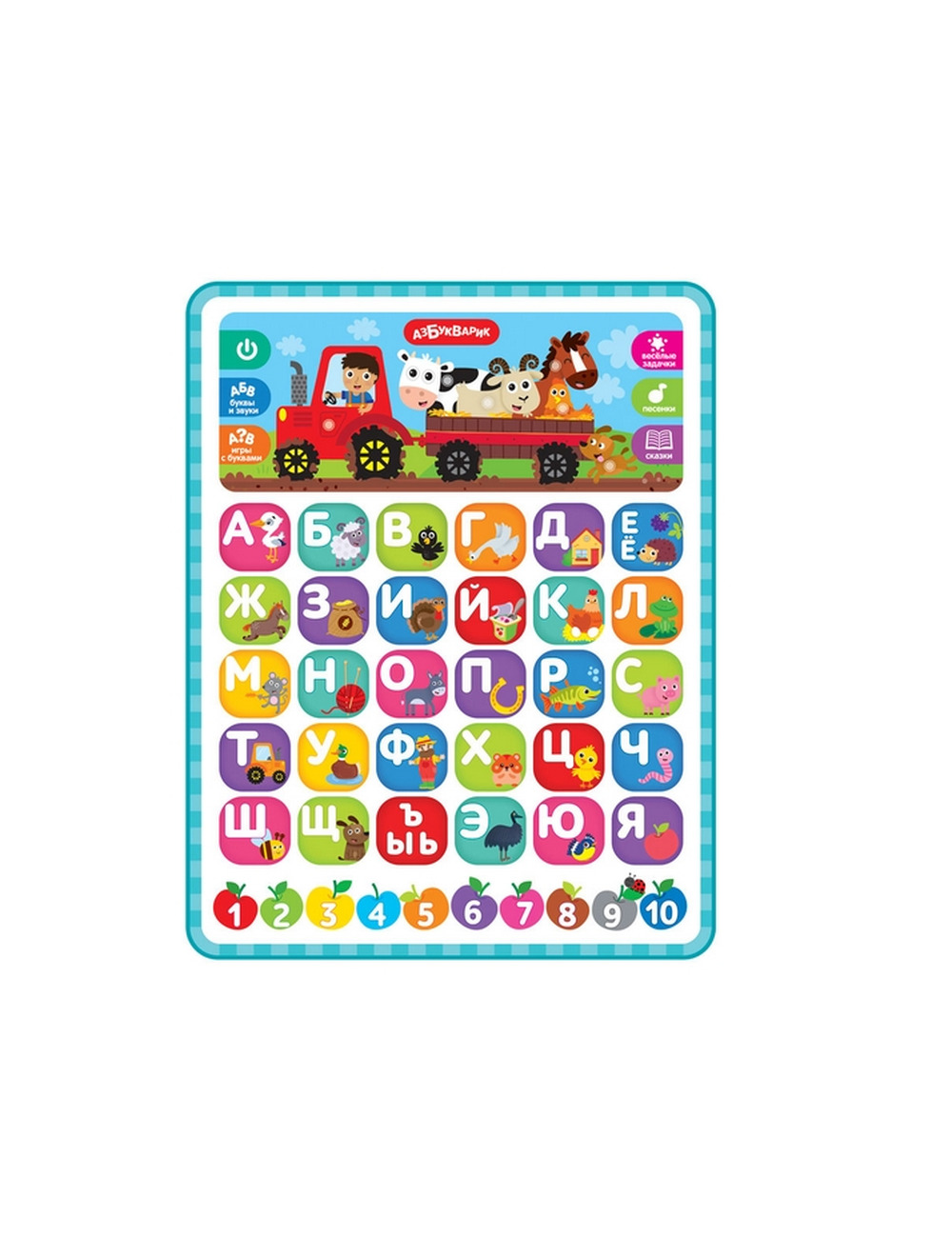 С новым обучающим планшетиком «Азбука Веселая ферма» скучать не придется! Ведь в нем столько всего интересного: буквы, цифры, животные, песенки, стихи и загадки.