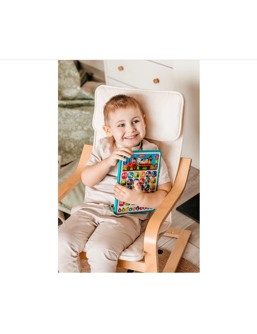 Планшетик выполнен из полностью безопасного материала и идет в комплекте с батарейками.