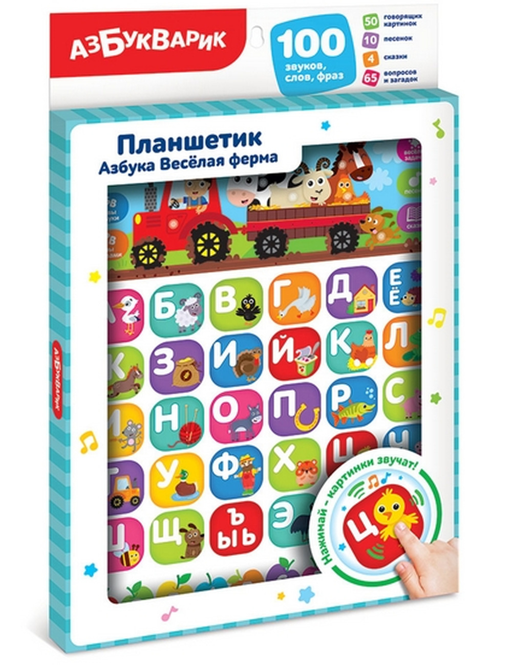 Нажимая на кнопочки, малыш выучит буквы и запомнит, как они звучат, познакомится цифрами, цветами и обитателями фермы! Познавательные песенки, 65 вопросов и задачек в стихах помогут проверить знания и сделают обучение более увлекательным! А после занятий можно послушать новый хит – песенку «Красный трактор» и еще 5 песенок зверят, а также 4 сказки («Гуси-лебеди», «Коза-дереза», «Солнышко», «Гав-гав»).