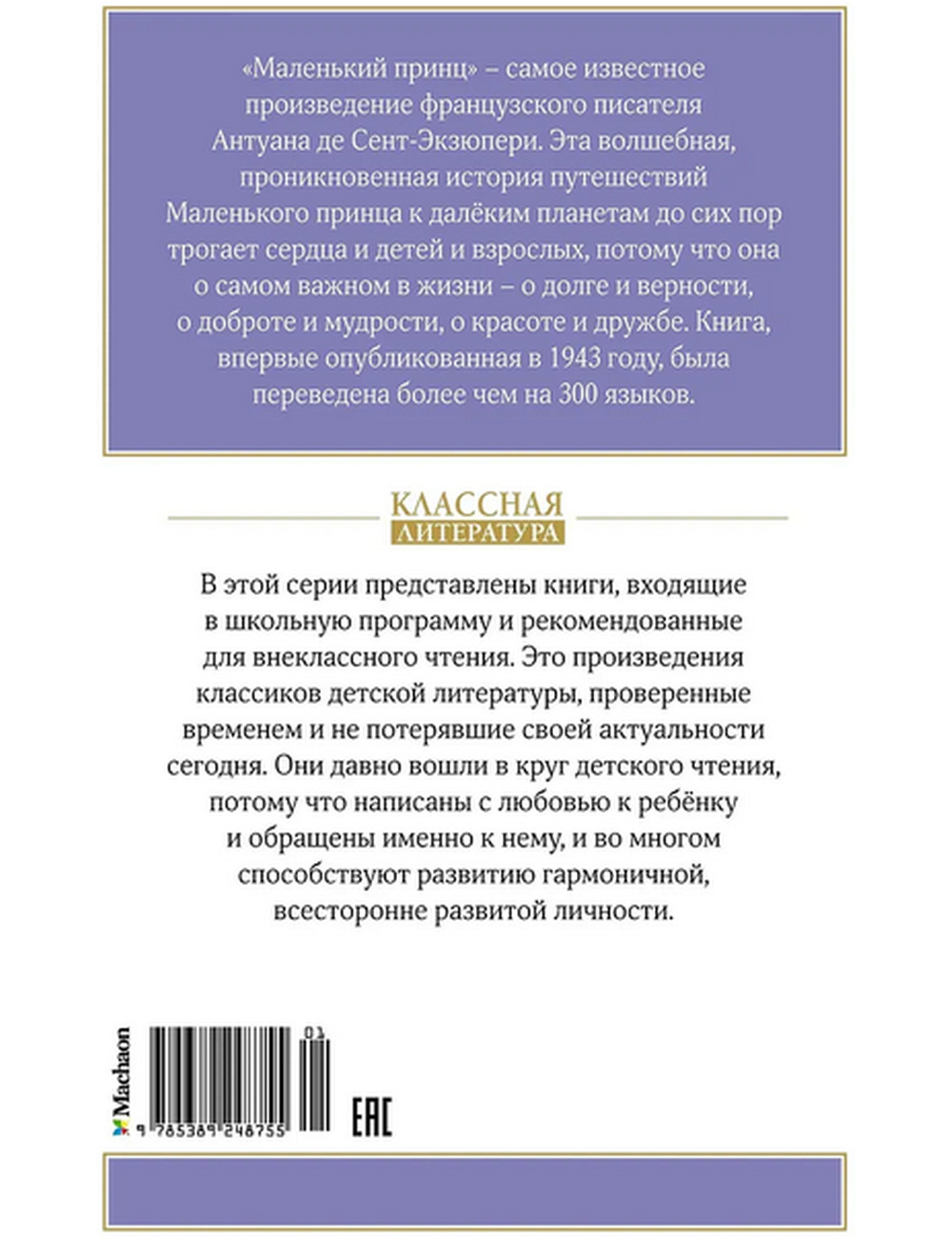 «Маленький принц» – самое известное произведение французского писателя Антуана де Сент-Экзюпери. Эта волшебная, проникновенная история путешествий Маленького принца к далёким планетам до сих пор трогает сердца и детей и взрослых, потому что она о самом важном в жизни – о долге и верности, о доброте и мудрости, о красоте и дружбе. Книга, впервые опубликованная в 1943 году, была переведена более чем на 300 языков.