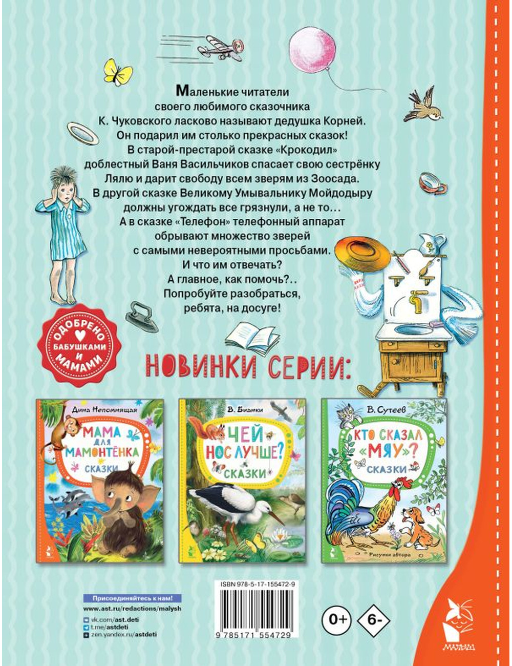 Корней Иванович Чуковский (1882—1969) — основоположник отечественной детской литературы. Один из самых читаемых детских поэтов. В нашей книге три сказки в стихах: "Телефон", "Мойдодыр" и "Крокодил" (Старая-престарая сказка). Иллюстрации выдающегося художника-классика детской книги В. Сутеева.