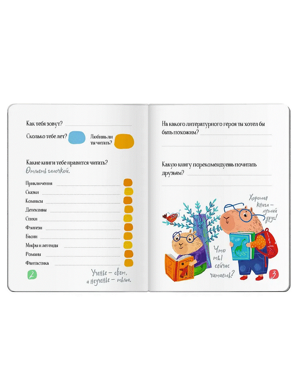 В "Капибарах" ребёнок запишет название и автора книги, определит жанр и вспомнит сюжет. Перечислит главных героев и объяснит, почему кто-то из них ему особенно понравился. Выскажет общее впечатление о книге, поставит ей оценку-звёздочку и нарисует иллюстрацию или картинку-настроение - в "Капибарах" на каждом развороте есть место для рисунка. Для любителей литературных гаданий найдутся свои странички. Надо взять любимую книгу, задать вопрос, открыть её наугад и выбрать случайную строчку. А ответ потом записать на память в дневнике.