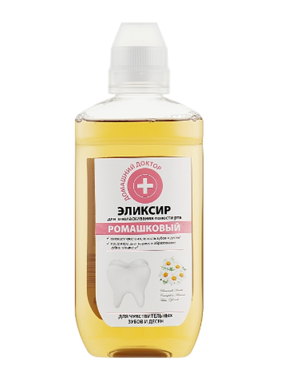 Европейская торговая компания «Домашний Доктор» специализируется на выпуске лечебных и профилактических средств по уходу за телом и волосами, которые способны позаботиться о здоровье всей вашей семьи. Представляем вашему вниманию ромашковый эликсир для ополаскивания полости рта данного бренда. Это дополнительное гигиеническое средство в комплексе с зубной пастой способно обеспечить вам здоровье десен и зубов, а также придать свежесть вашему дыханию.