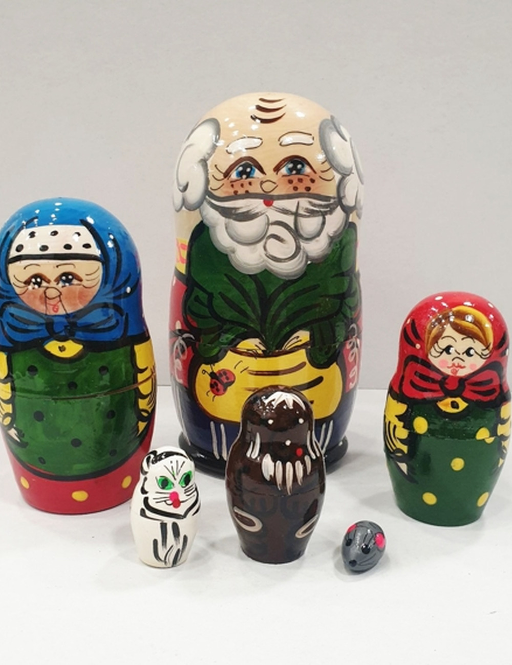 Матрёшка «Репка» состоит из 6 расписных куколок, с помощью которых вы оживите сказку. Также малыш сможет собирать из двух элементов каждого персонажа и укладывать деревянные фигурки друг в друга. Такая игра обучит кроху понятиям «больше» и «меньше».