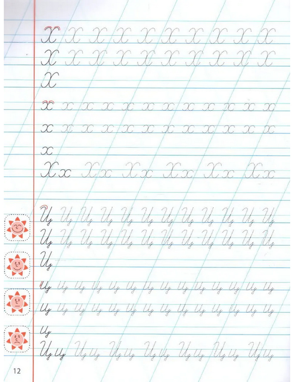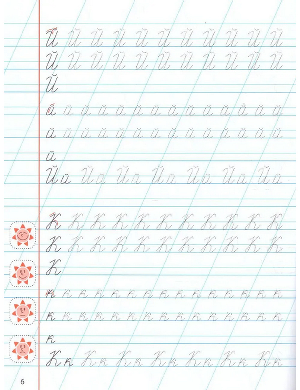Прописные и строчные буквы 6-7 лет. Классические прописи (новые). Эти прописи полностью соответствуют требованиям по формированию у ребёнка правильных навыков каллиграфического письма. Они помогут развить зрительное восприятие, внимание, мелкую моторику и координацию движения руки. Стрелки указывают начало каждого безотрывного движения руки при написании буквы по точкам. Чтобы ребёнок не уставал, занимайтесь с ним не более 25 минут. Обязательно оцените его старания и похвалите за усердие. Предложите ребёнку самостоятельно оценить выполненную им на странице работу - обвести солнышко с соответствующей оценкой.