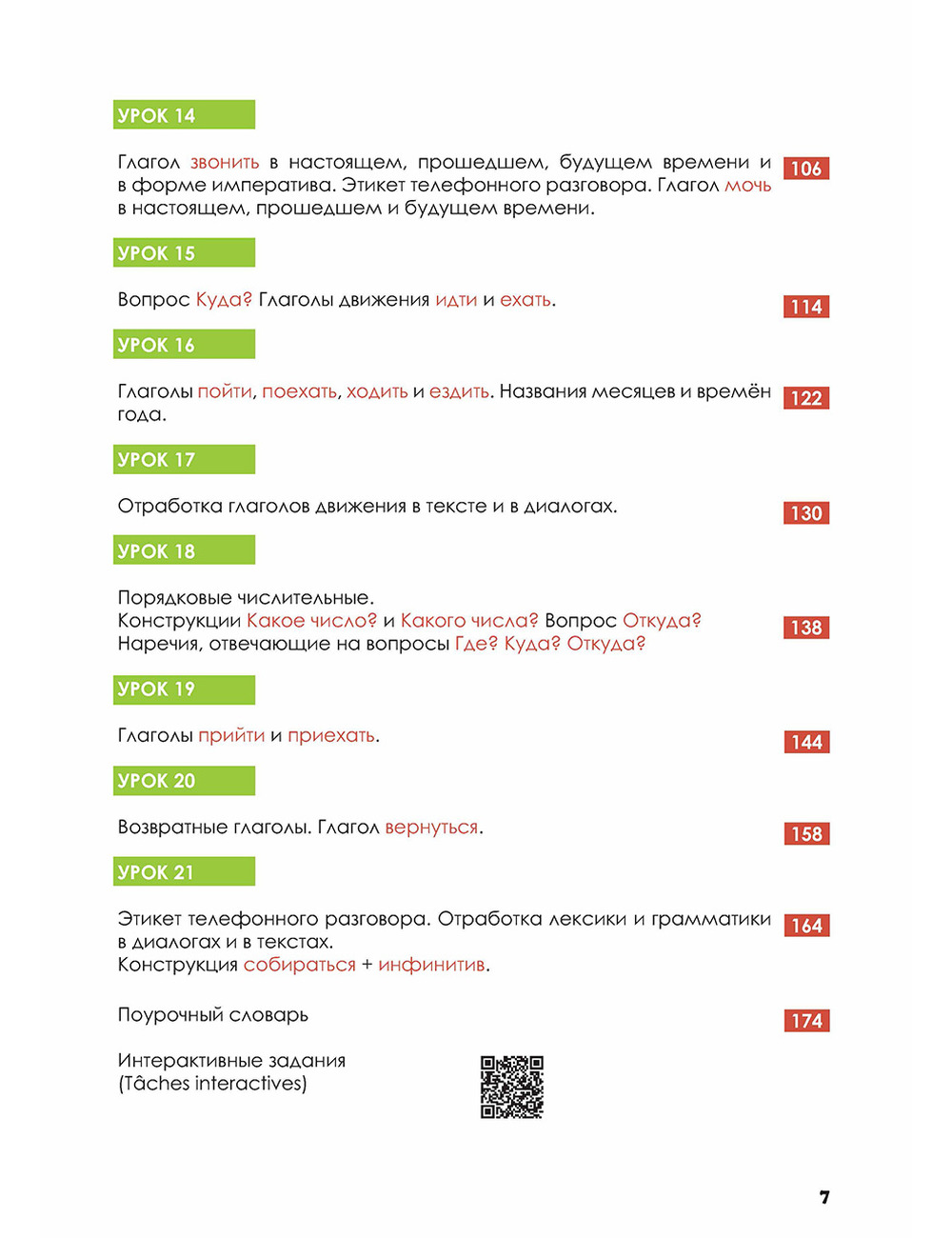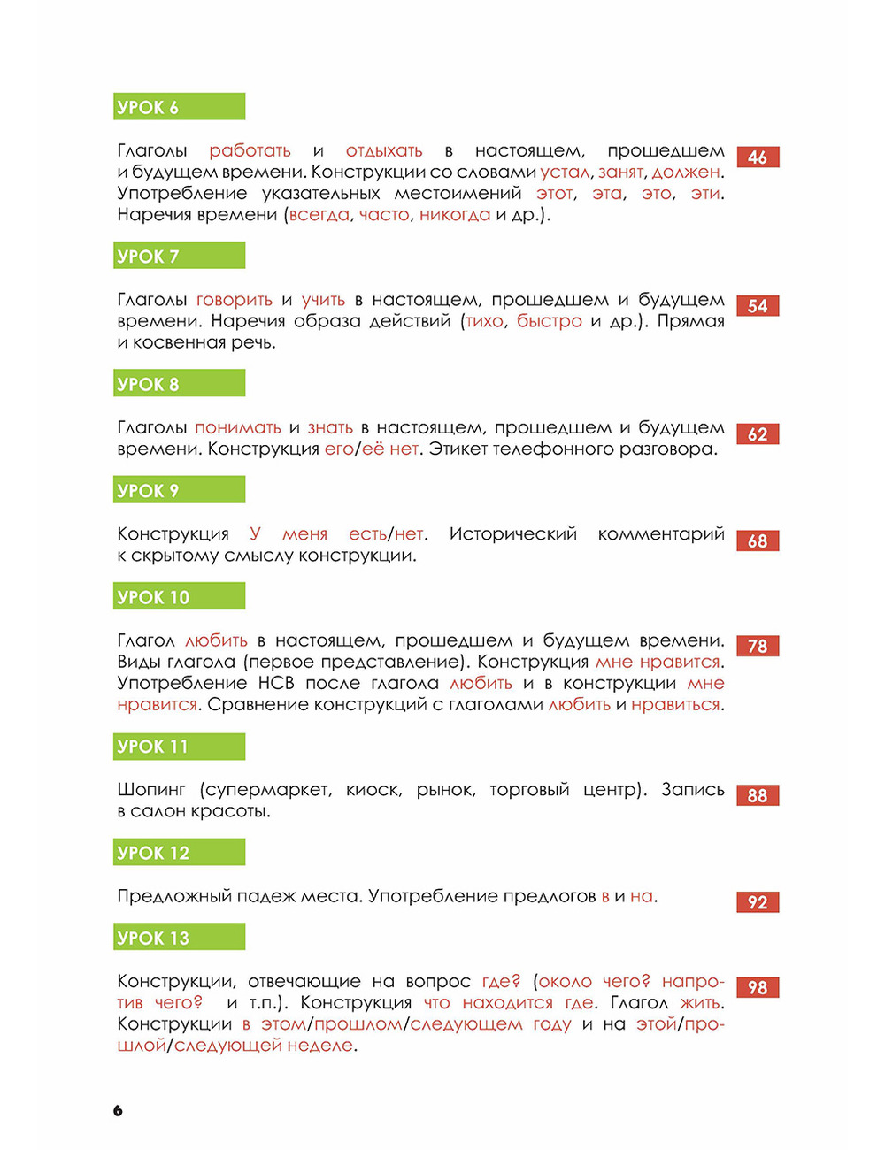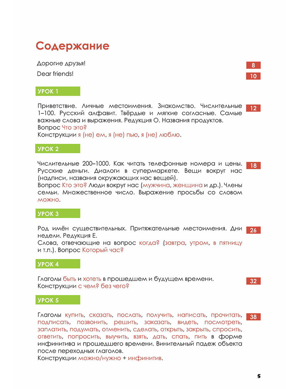 The textbook is an intensive course of the Russian language, its main objective is to help a foreigner to join the Russian-speaking environment as quickly and effectively as possible in Russian with a minimum level of language proficiency. The sequence of presentation of grammatical and lexical material is determined by communicative necessity: the more necessary any lexical unit or grammatical construction is in real-life communication situations, the earlier it is introduced in the course. The textbook contains a lot of authentic dialogues, texts with interactive tasks, exercises, a large number of jokes and anecdotes, as well as some data on the history of the language (in the form of comments).
