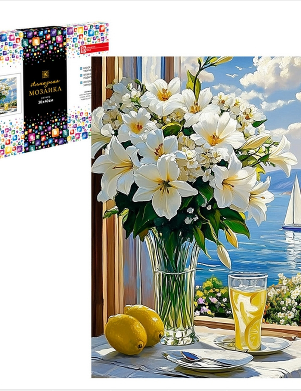 Алмазная мозаика (набор для творчества) БУКЕТ ЛИЛИЙ, размер: 30x40 см, (28 цветов страз, холст на подрамнике с напечатанной картиной, покрытый клеевым слоем и защитной пленкой, пакеты со стразами, стилус, лоток для страз, силикон для страз, клей, подвесы для подрамника, пинцет металлический, схема, дополнительные пакеты с zip-молнией, стикеры для нумерации zip-пакетов в комплекте, форма страз: квадратная, тип выкладки: полная, картонная коробка)