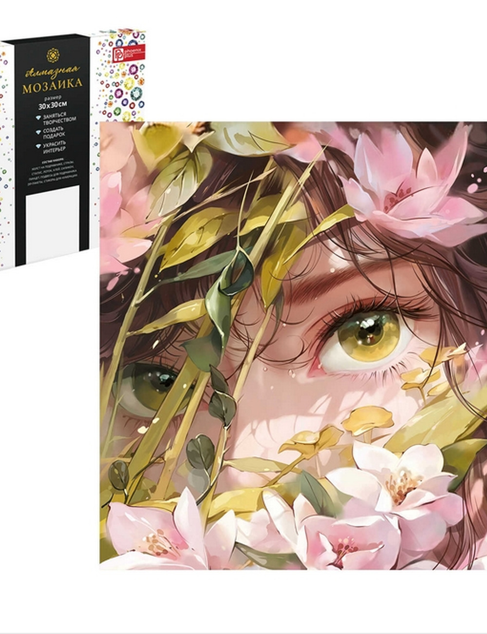 Алмазная мозаика ДЕВУШКА В МАГНОЛИЯХ, размер: 30*30 см, (24 цветов страз, холст на подрамнике с напечатанной картиной, покрытый клеевым слоем и защитной пленкой, пакеты со стразами, стилус, лоток для страз, силикон для страз, клей, подвесы для подрамника, пинцет металлический, схема, дополнительные пакеты с zip-молнией, стикеры для нумерации zip-пакетов в комплекте, форма страз: круглая, тип выкладки: полная, картонная коробка)