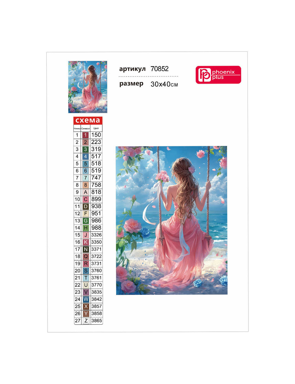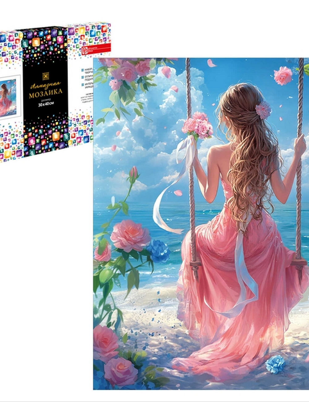 Алмазная мозаика ДЕВУШКА НА КАЧЕЛЯХ, размер: 30x40 см, (27 цветов страз, холст на подрамнике с напечатанной картиной, покрытый клеевым слоем и защитной пленкой, пакеты со стразами, стилус, лоток для страз, силикон для страз, клей, подвесы для подрамника, пинцет металлический, схема, дополнительные пакеты с zip-молнией, стикеры для нумерации zip-пакетов в комплекте, форма страз: квадратная, тип выкладки: полная, картонная коробка)