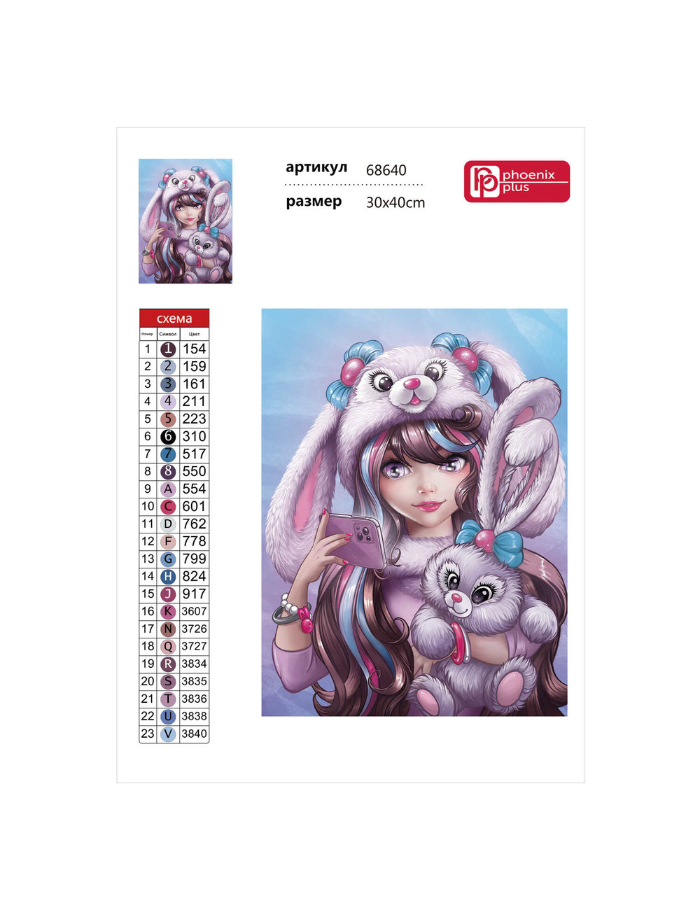 Алмазная мозаика ДЕВУШКА С ЗАЙКОЙ, размер: 30*40 см, (23 цветов страз, холст на подрамнике с напечатанной картиной, покрытый клеевым слоем и защитной пленкой, пакеты со стразами, стилус, лоток для страз, силикон для страз, клей, подвесы для подрамника, пинцет металлический, схема, дополнительные пакеты с zip-молнией, стикеры для нумерации zip-пакетов в комплекте, форма страз: круглая, тип выкладки: полная, картонная коробка)