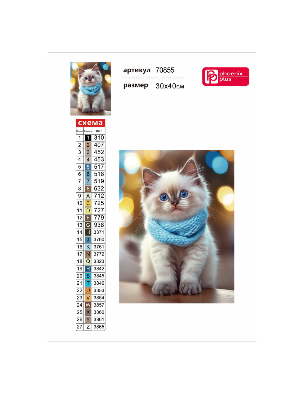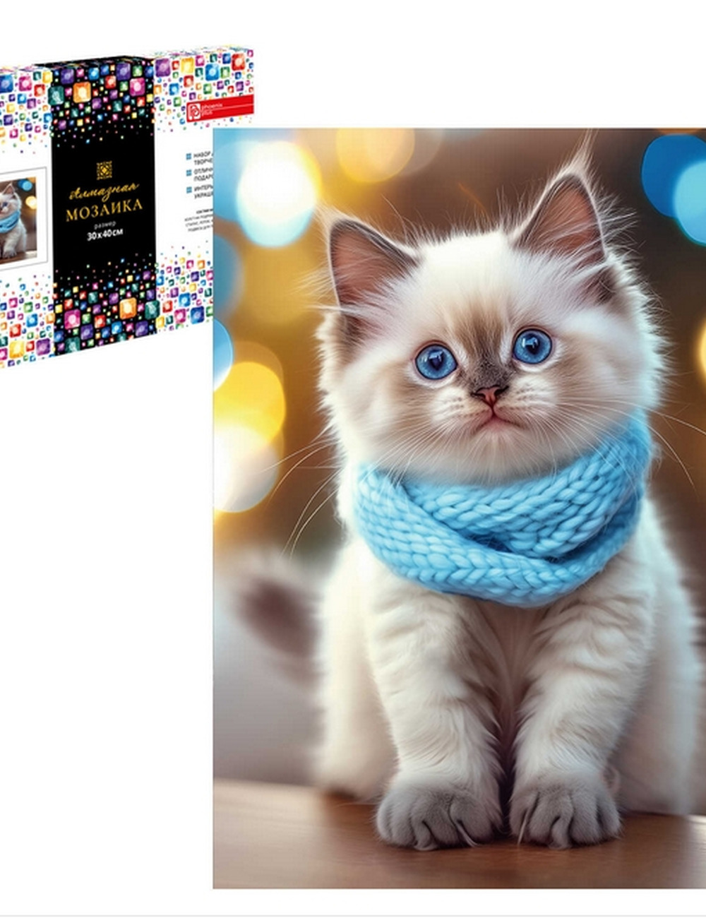 Алмазная мозаика (набор для творчества)КОТ В ШАРФЕ, размер: 30x40 см, (27 цветов страз, холст на подрамнике с напечатанной картиной, покрытый клеевым слоем и защитной пленкой, пакеты со стразами, стилус, лоток для страз, силикон для страз, клей, подвесы для подрамника, пинцет металлический, схема, дополнительные пакеты с zip-молнией, стикеры для нумерации zip-пакетов в комплекте, форма страз: квадратная, тип выкладки: полная, картонная коробка)