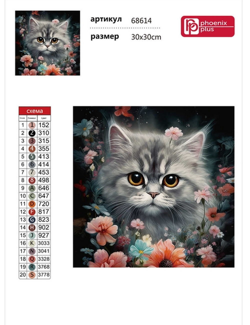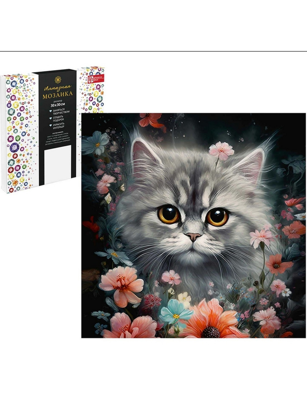 Алмазная мозаика Котик в ночном поле, размер: 30*30 см, (20 цветов страз, холст на подрамнике с напечатанной картиной, покрытый клеевым слоем и защитной пленкой, пакеты со стразами, стилус, лоток для страз, силикон для страз, клей, подвесы для подрамника, пинцет металлический, схема, дополнительные пакеты с zip-молнией, стикеры для нумерации zip-пакетов в комплекте, форма страз: круглая, тип выкладки: полная, картонная коробка)