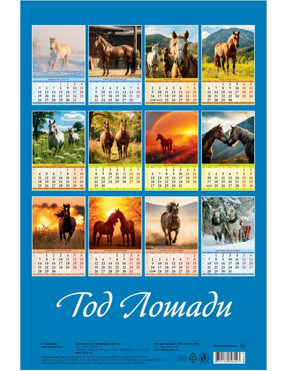 Настенный перекидной календарь на металлическом гребне с ригелем, формат 320х480 мм, в индивидуальной упаковке (европакет). Состоит из красочных обложки и подложки на глянцевом мелованном картоне плотностью 235 г/м2, покрытых УФ-лаком, которые скреплены металлическим гребнем с внутренним блоком (6 листов). Листы внутреннего блока - слайд и крупная календарная сетка на каждый месяц на глянцевой мелованной бумаге