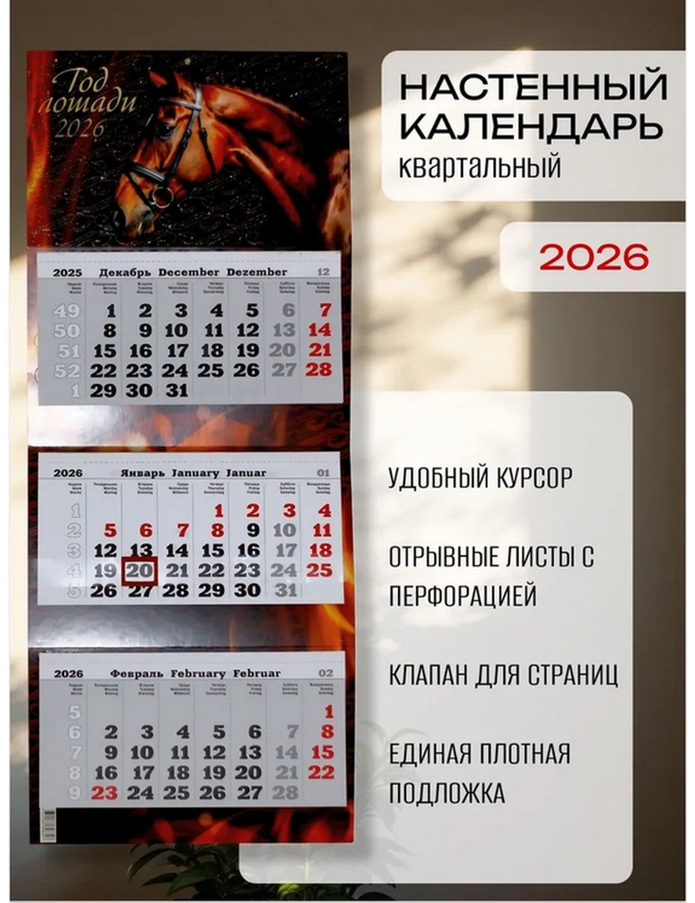 Элегантный квартальный календарь 2026 года с тематикой символа года — лошадь, выполнен в современном дизайне, станет стильным акцентом в любом интерьере. Его композиция из трёх блоков на общей подложке обеспечивает чёткость планирования и удобство ежедневного использования благодаря качественной печати на плотной бумаге.