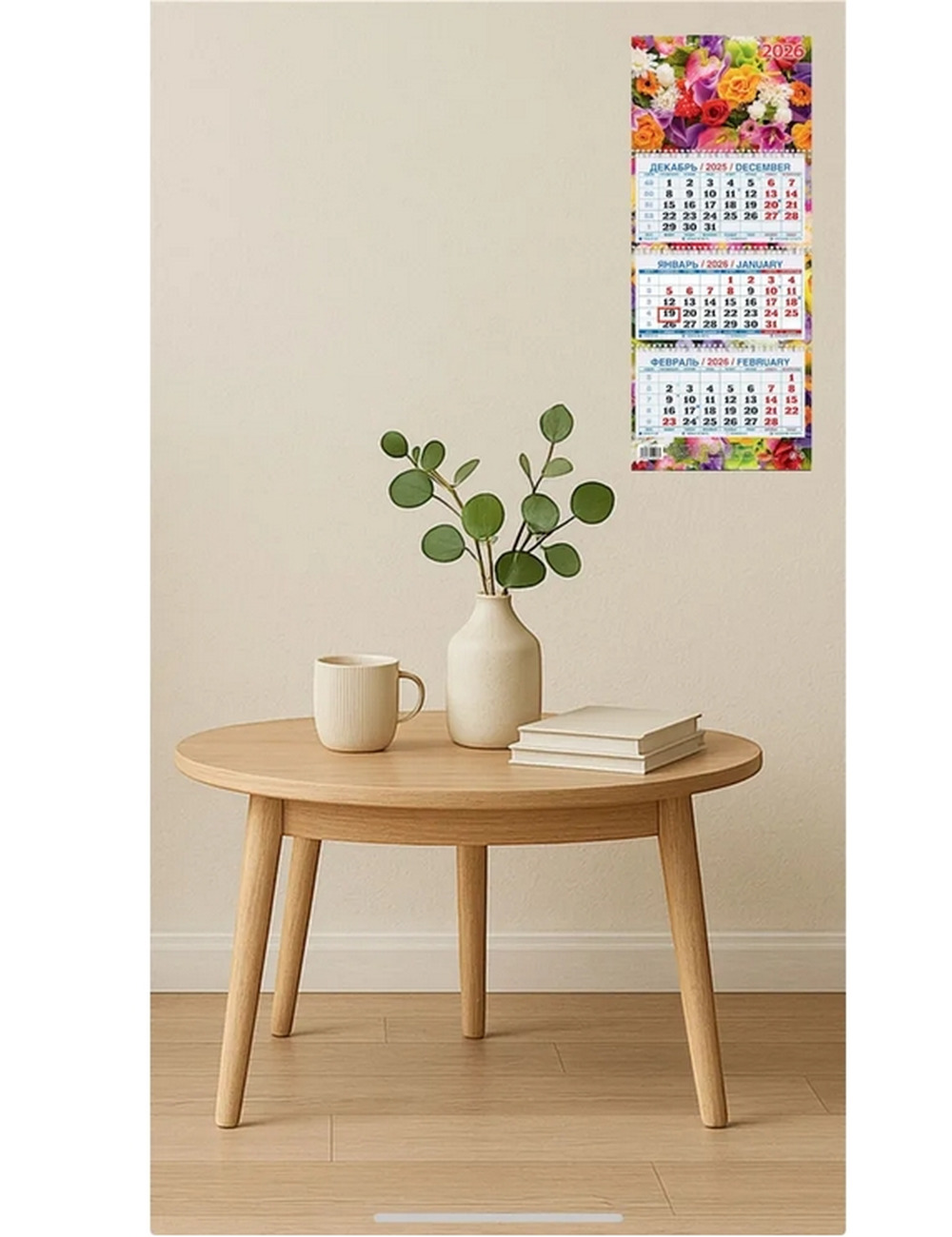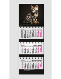 Настенный квартальный трёхблочный календарь с курсором, формат 195х465 мм, в индивидуальной упаковке (европакет). Календарь состоит из красочного постера на плотном мелованном картоне, покрытого УФ-лаком, трёх календарных блоков на офсетной бумаге плотностью 70 г/м2, запечатанных в 2 краски и расположенных на полноцветных красочных подложках. Календарь скреплён тремя металлическими гребнями.