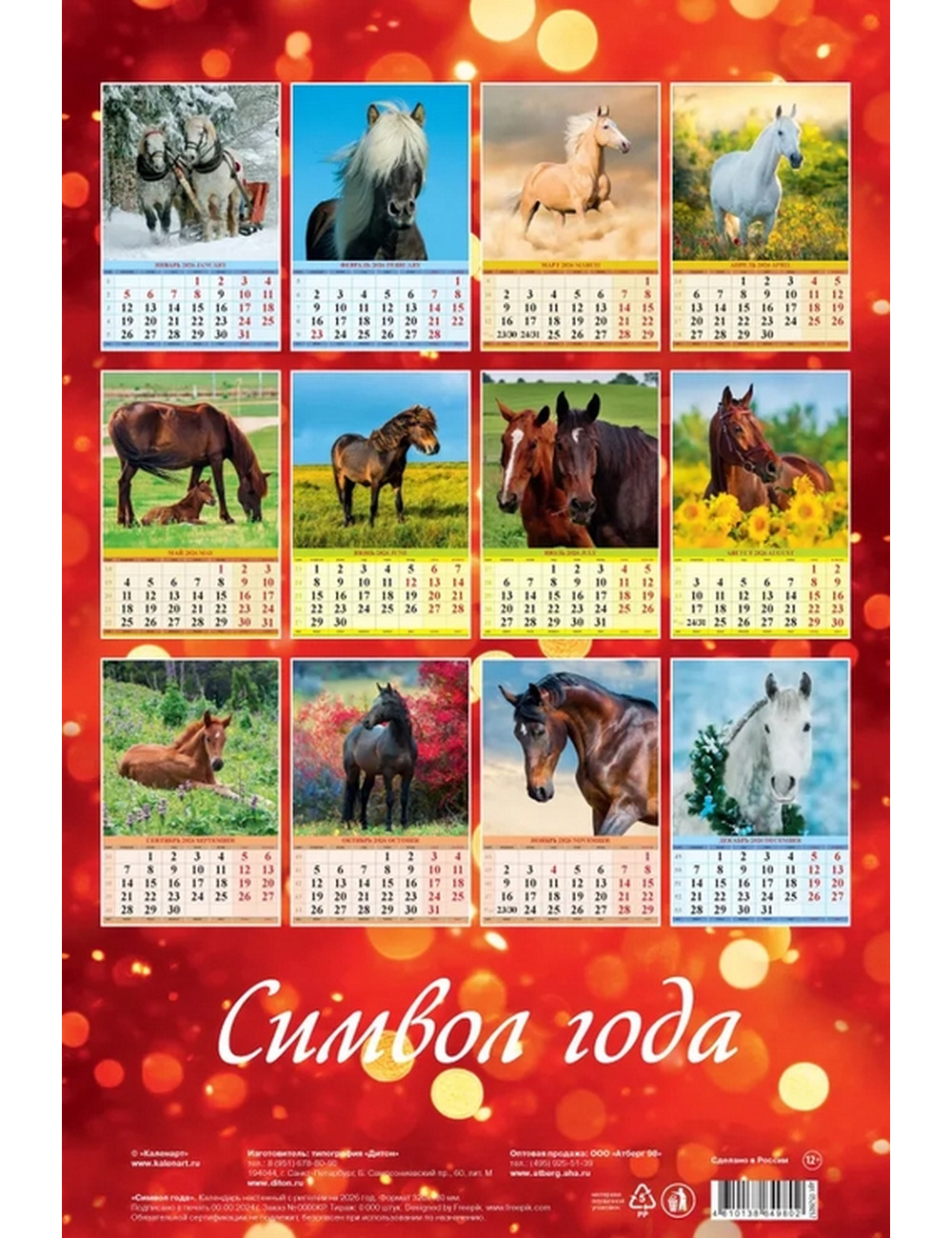 Настенный перекидной календарь на металлическом гребне с ригелем, формат 320х460 мм, в индивидуальной упаковке (европакет). Состоит из красочных обложки и подложки на глянцевом мелованном картоне плотностью 235 г/м2, покрытых УФ-лаком, которые скреплены металлическим гребнем с внутренним блоком (6 листов). Листы внутреннего блока - слайд и крупная календарная сетка на каждый месяц на глянцевой мелованной бумаге