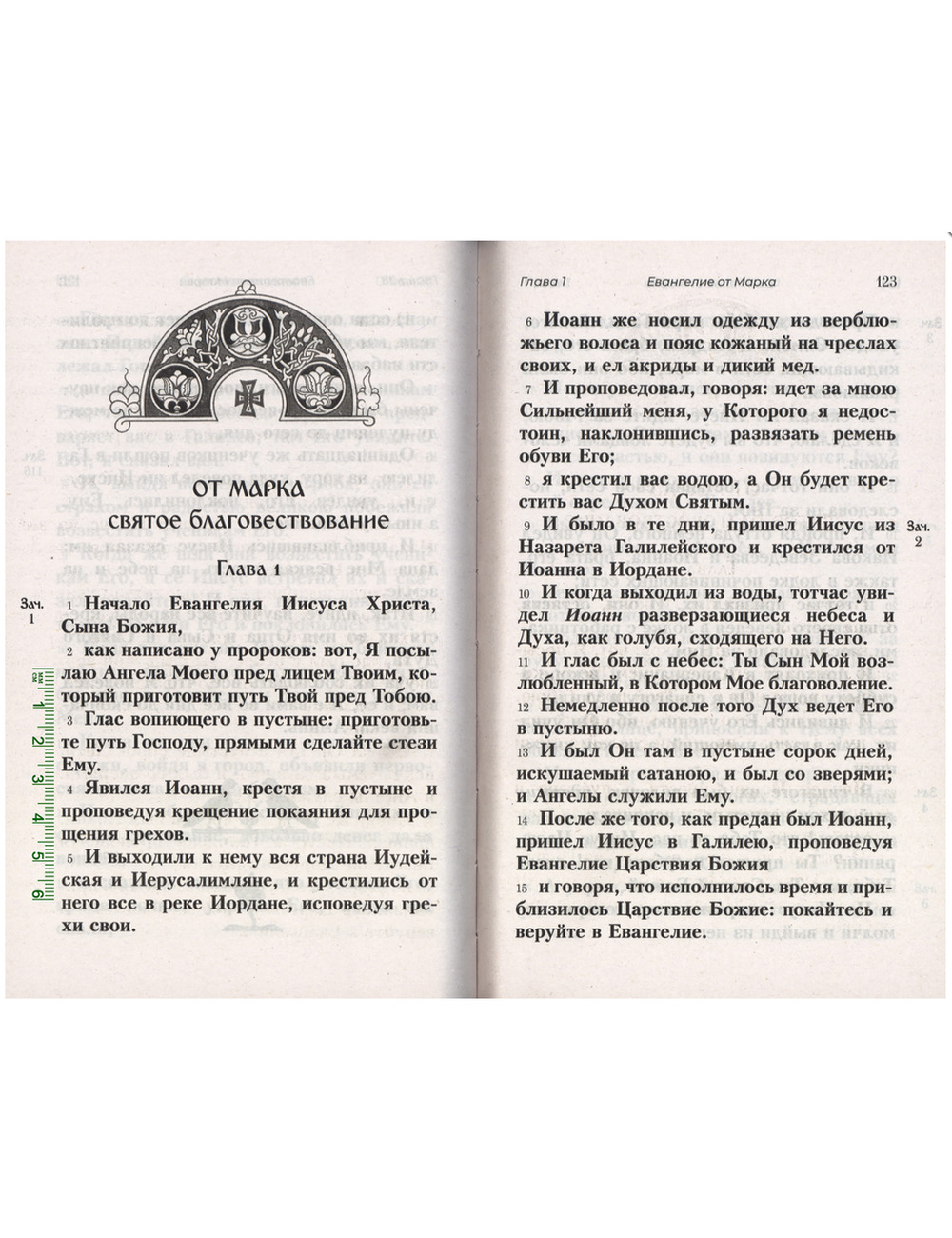 Святое Евангелие среднего формата на русском языке. Текст напечатан стандартным шрифтом, содержит церковные зачала.
