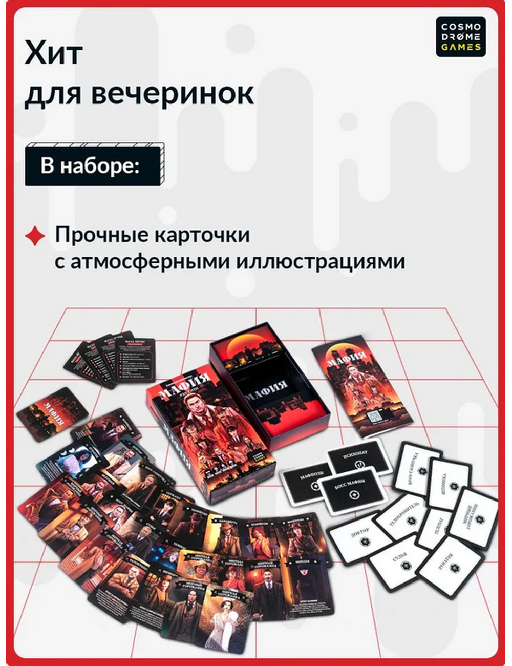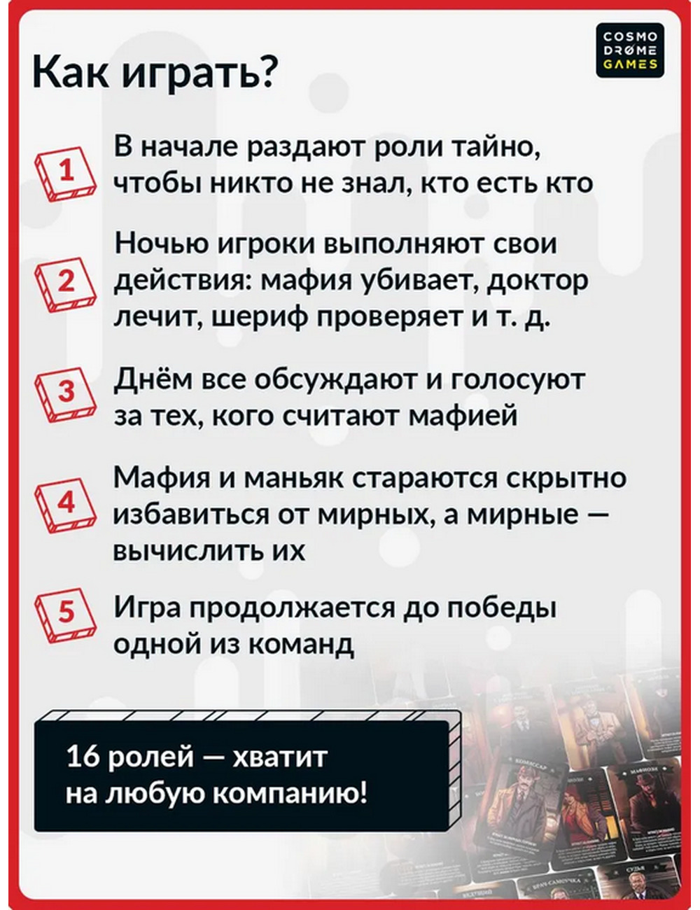 Каждая роль — уникальна: будь то хитрый Босс мафии, всевидящий Комиссар или одиночка-Психопат, играющий только за себя.