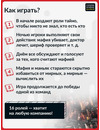 Ночью мафия убивает, мирные стараются выжить, а особые роли действуют по-своему. Днём — споры, подозрения и голосования. Побеждает тот, кто переиграет остальных — словом, интуицией и блефом.