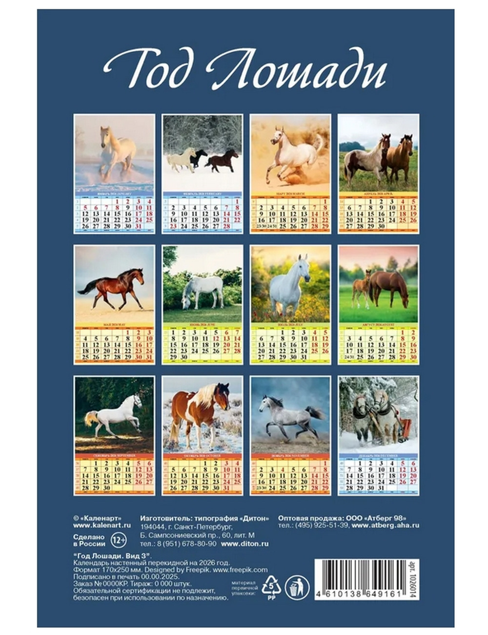 Настенный перекидной календарь на металлическом гребне с ригелем, формат 170х250 мм, в индивидуальной упаковке (европакет). Состоит из красочных обложки и подложки на глянцевом мелованном картоне плотностью 235 г/м2, покрытых УФ-лаком, которые скреплены металлическим гребнем с внутренним блоком (6 листов). Листы внутреннего блока - слайд и крупная календарная сетка на каждый месяц на глянцевой мелованной бумаге