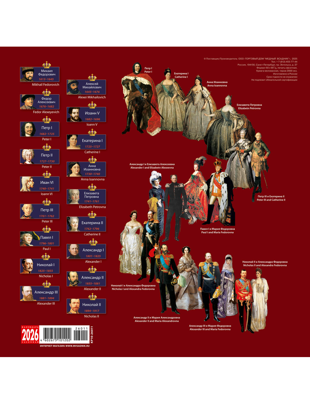 Настенный календарь " Русские цари" на 2026 год дает представление об этапах исторического развития России, связанных с правлением определенных самодержцев, чьи портреты, сопровождаемые датами их жизни, воспроизводятся в календаре.
