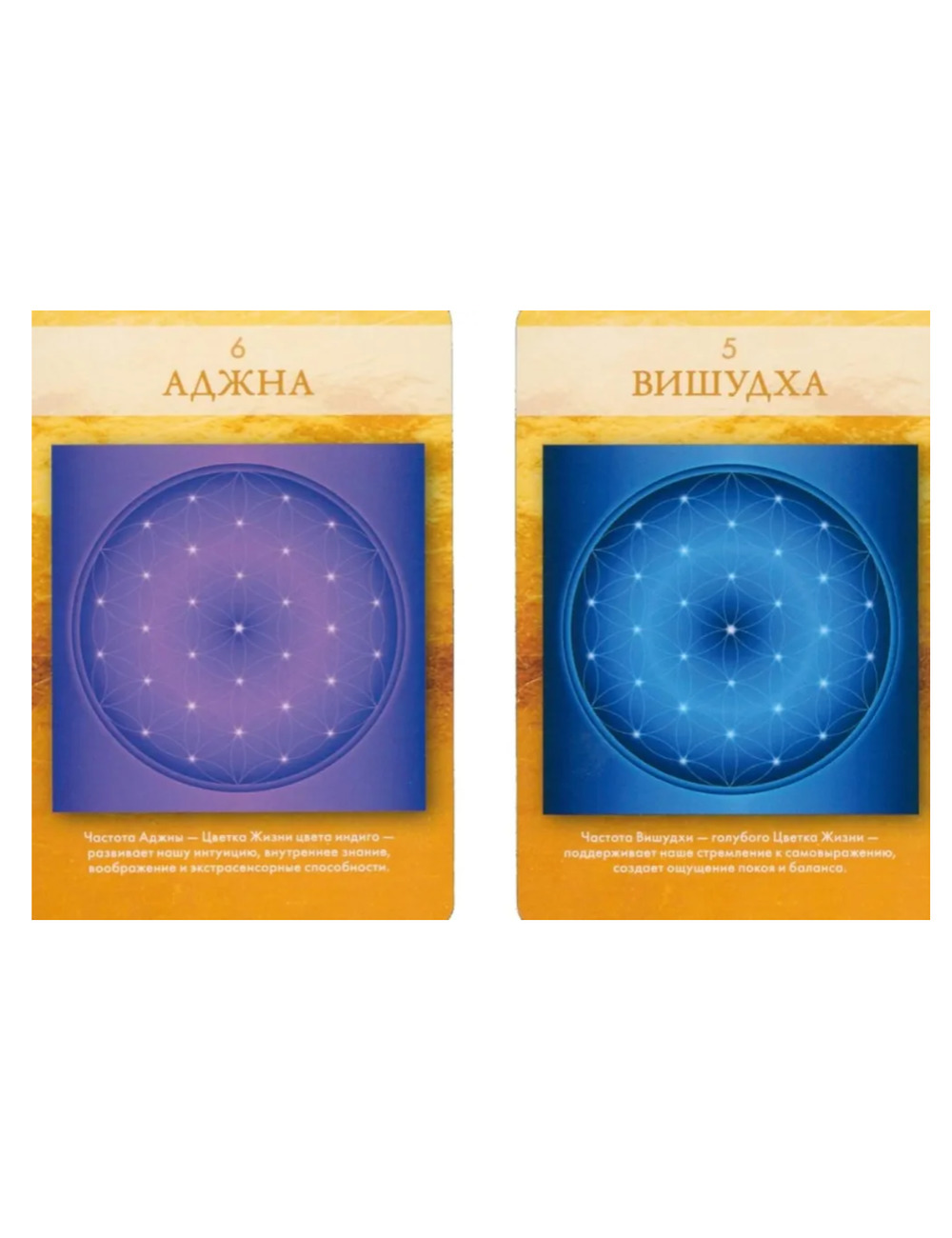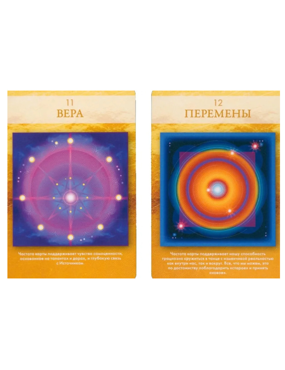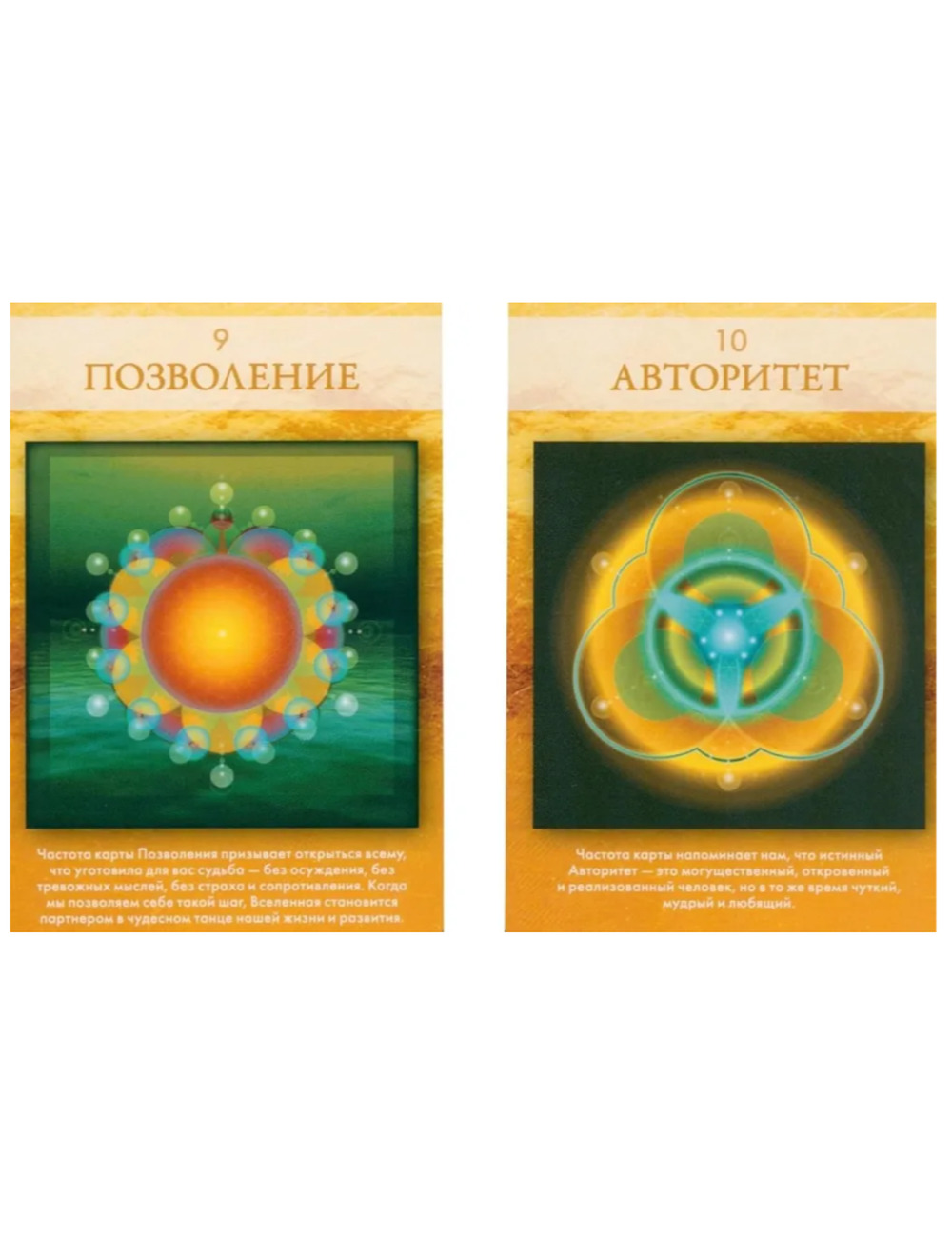 Помимо активных действий в физическом мире (это в первую очередь!), можно работать еще и с миром энергий — повышать частоту своих вибраций. Формула простая: чем выше вибрации, тем больше положительного вы притягиваете в свою жизнь. В этом поможет колода "Сакральной геометрии". Геометрические фигуры, изображенные на картах, и то, как именно они расположены, работают как визуальные инструменты, помогающие активировать тонкие энергии вокруг и внутри вас. Так происходит настройка на нужные вибрации более высокой частоты. В колоде есть карты Любви, Божественной Женщины, Коммуникации — все эти вибрации закодированы в них.