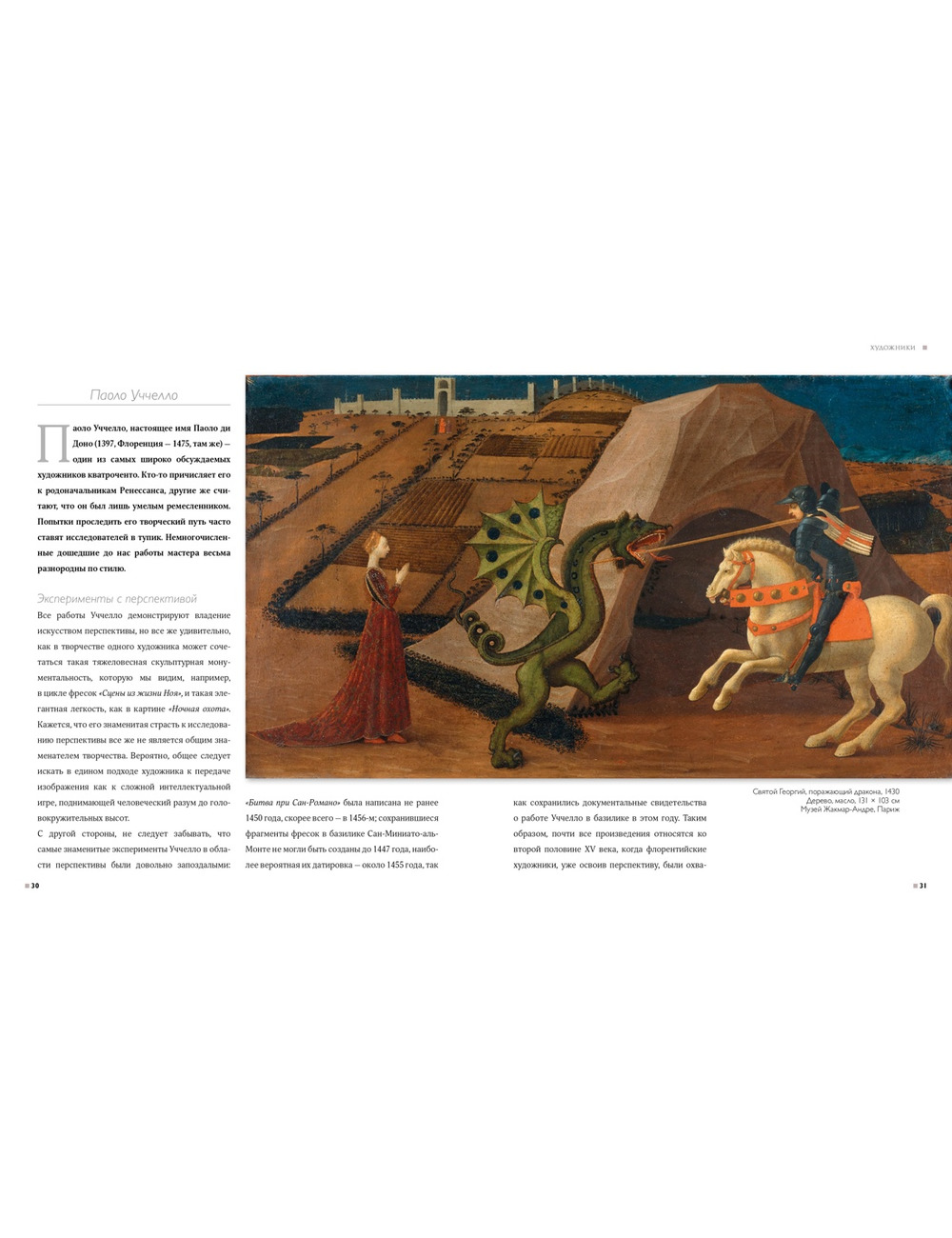 Красочный альбом «Великие мастера Возрождения» доставит удовольствие не только иллюстрациями, но и последовательным и очень полным рассказом о том, как развивалось европейское искусство эпохи Возрождения. Здесь и описание того, как повлияла история Италии на изменение искусства этой страны, а затем и всей Европы. И объяснение как математика помогала Пьеро делла Франческа создавать фрески. Чем отличается стиль Боттичелли. И почему Леонардо да Винчи отправился работать во Францию.