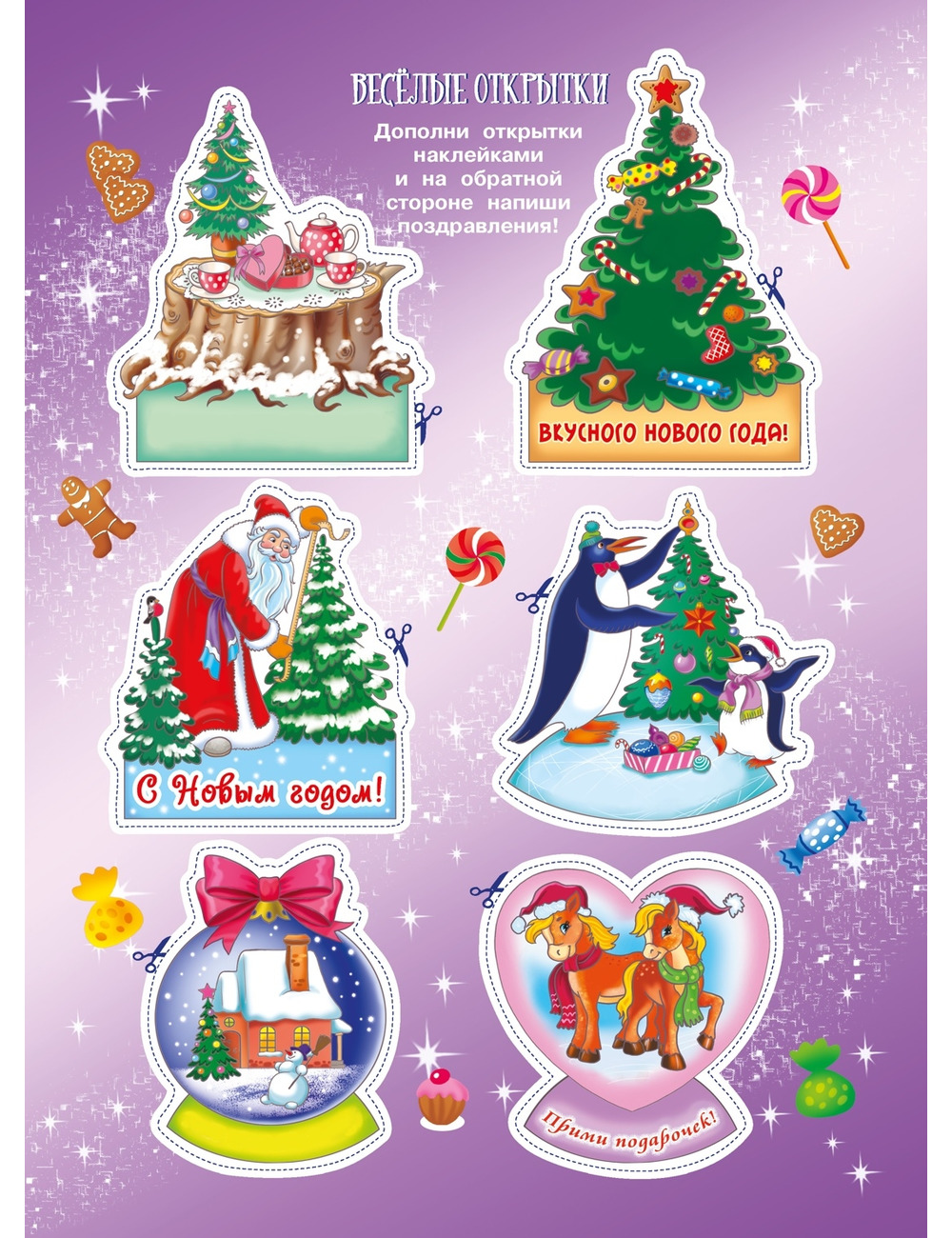 Книги напечатаны на плотной мелованной бумаге, из которой очень удобно вырезать поделки, и в них также есть разворот с наклейками – ими можно украсить открытки и игрушки для елки, а также приклеить, куда душа пожелает.